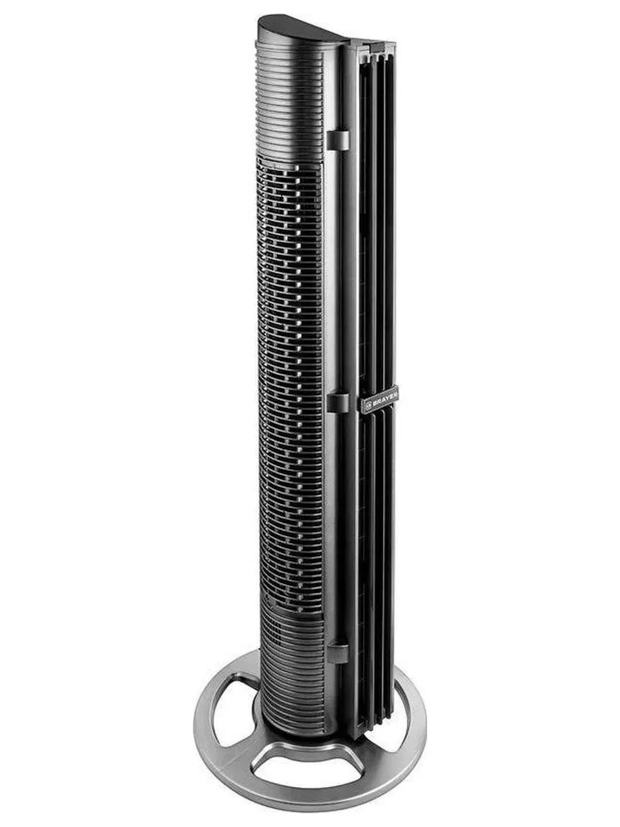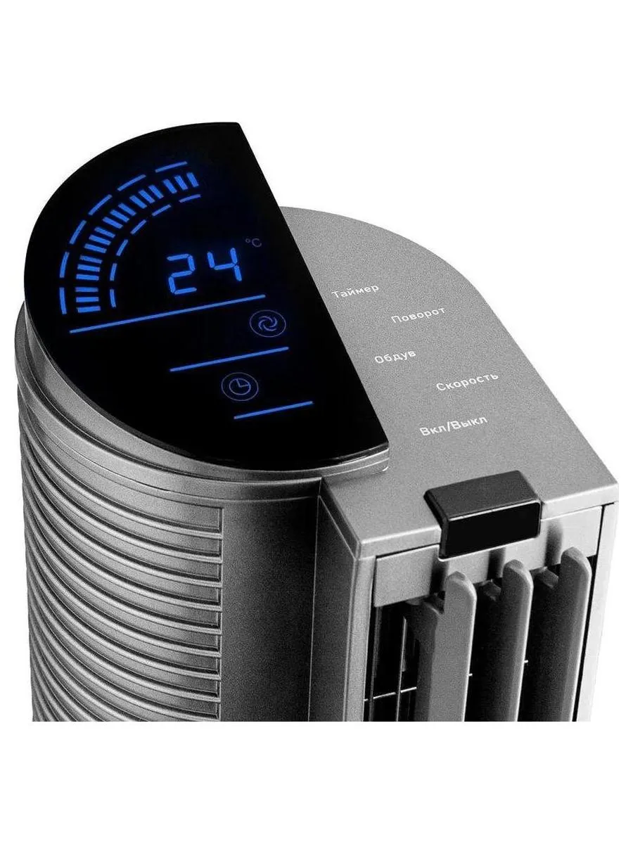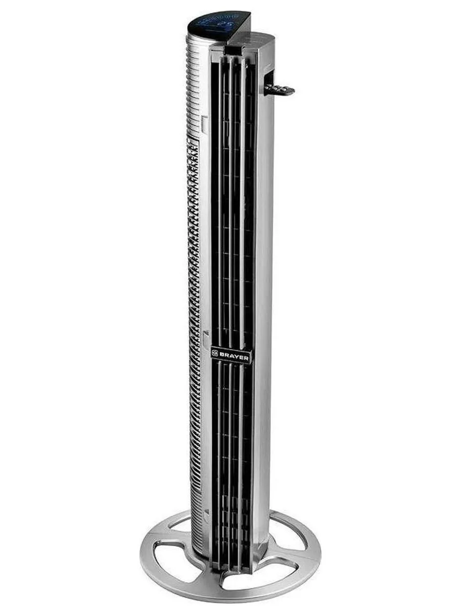 Вентилятор Brayer BR4977 колонного типа представлен в пластиковом корпусе серого цвета. Он предлагает 3 режима работы: обычный, ночной и бриз. Для плавной регулировки интенсивности обдува есть 6 скоростей. Вращение корпуса на 70° равномерно распределяет освежающий воздух в помещении.