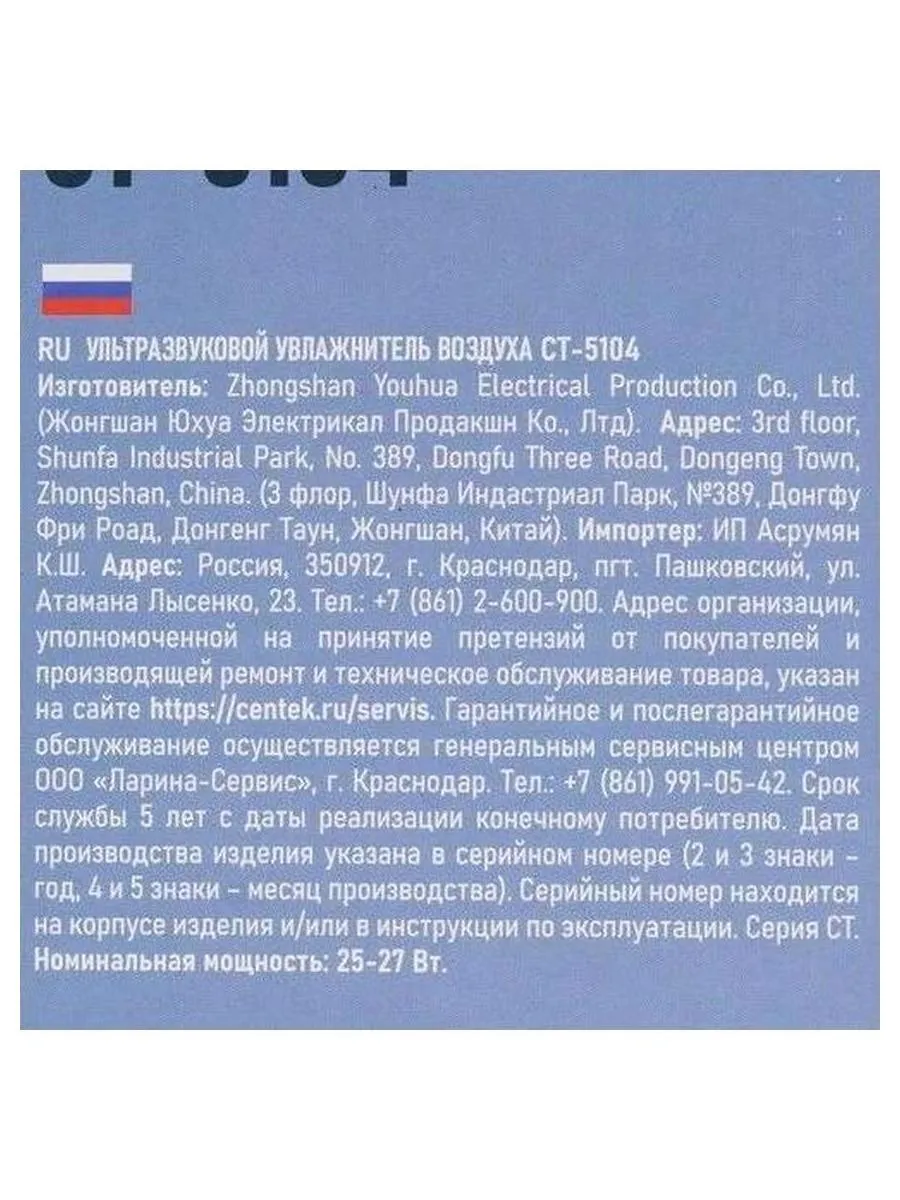 Описание товара Увлажнитель воздуха Centek СТ-5104 ультразвуковой