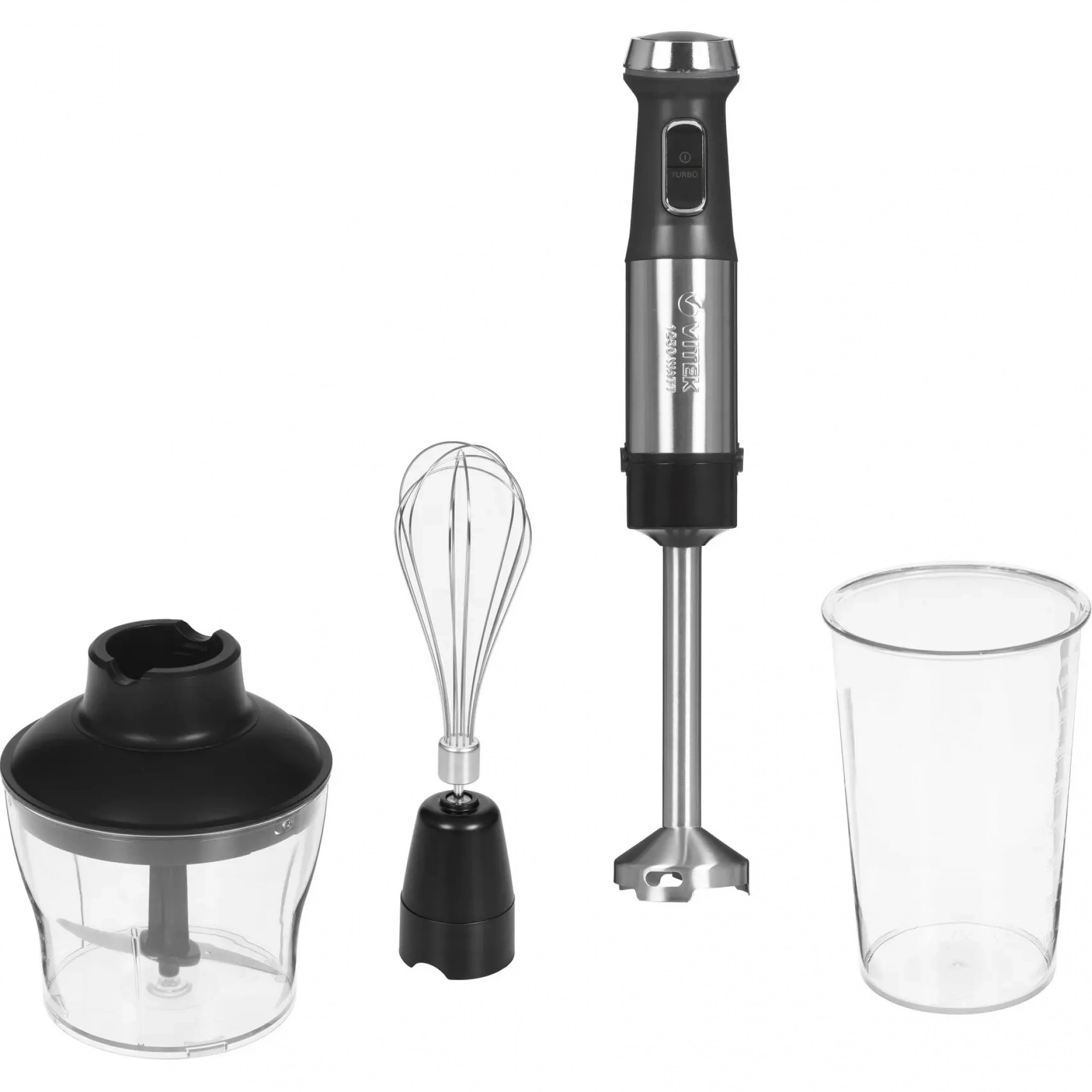 моторный блок, мерный стакан, насадка-блендер, насадка-венчик, насадка-измельчитель, документация, упаковка
