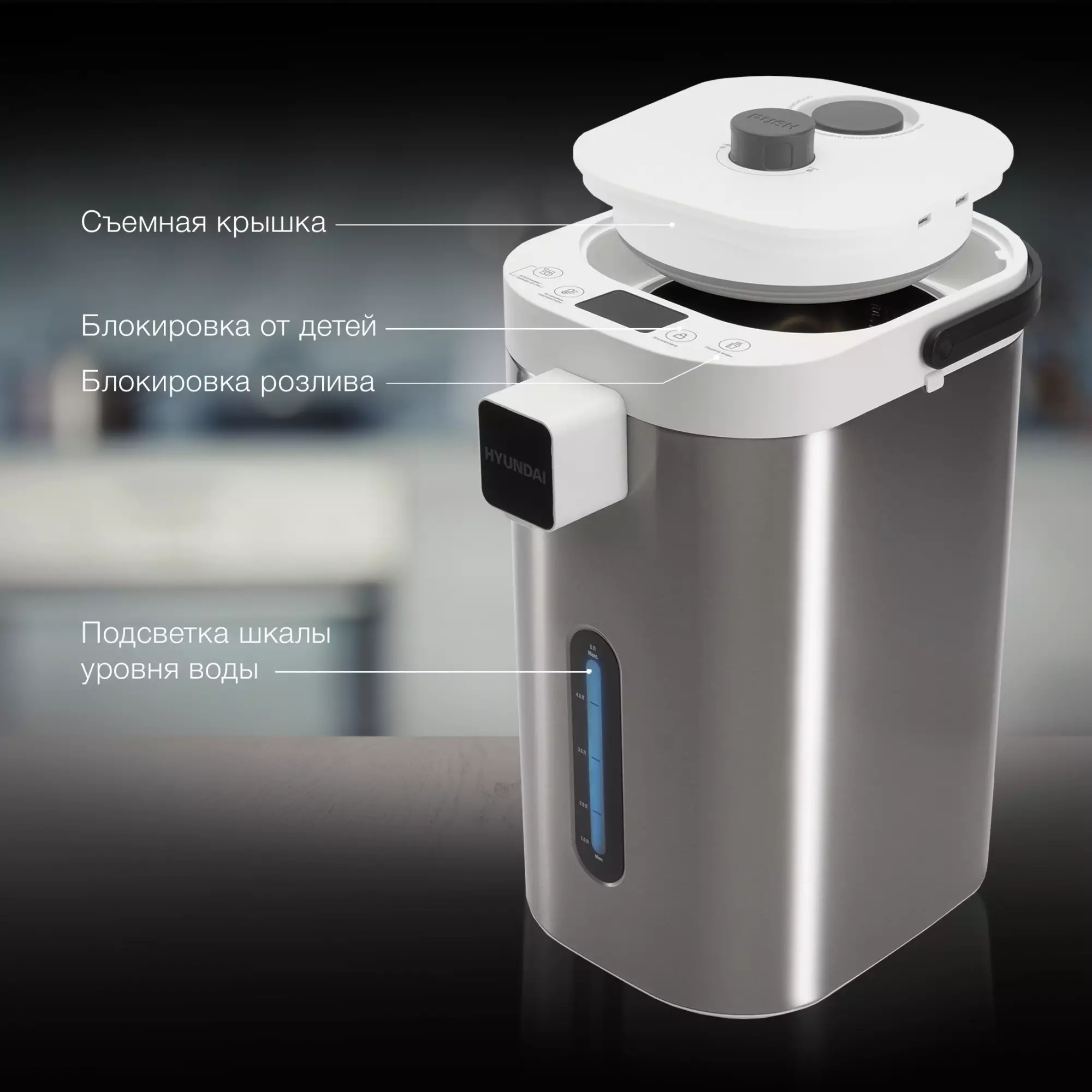 Термопот Hyundai HYTP-5235 cсочетает высокую мощность, вместительный объем и множество интеллектуальных функций. Станет незаменимым помощником на вашей кухне или в офисе. Сердцем Hyundai HYTP-5235 является мощный нагревательный элемент на 700 Вт, обеспечивающий быстрый нагрев воды. Для поддержания температуры в заданных пределах потребляет всего 45 Вт. Объем в 5 литров позволяет нагреть воду для всей семьи или рабочего коллектива. Наличие 12 температурных режимов в диапазоне от 40 °C до 100 °C, предоставляет возможность точной настройки температуры для любых напитков и блюд. Интуитивное управление термопотом HYTP-5235 делает его использование максимально простым и удобным. Автоматический насос обеспечивает легкий розлив воды как по нажатию кнопки, так и при нажатии чашкой на специальный механизм. ЖК-дисплей отображает текущую температуру и выбранные настройки, а подсветка шкалы уровня воды позволяет контролировать наполненность резервуара. Безопасность использования обеспечивается блокировкой включения без воды, защитой от перегрева, отключением при закипании и функцией защиты от детей. Корпус выполнен из высококачественной нержавеющей стали, что гарантирует долговечность и стильный внешний вид прибора. Колба изготовлена из пищевой стали 304, обеспечивающей гигиеничность и безопасность. Удобная ручка для переноски и съемная крышка делают использование термопота еще более комфортным. Отсоединяющийся шнур питания упрощает хранение и перемещение.
