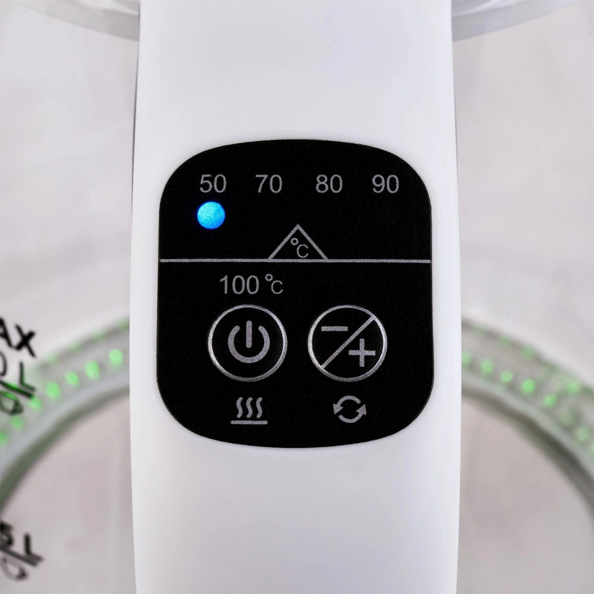 Электрический чайник Hyundai HYK-G8880 оборудован 2200-ваттным нагревательным элементом, быстро и равномерно нагревает до 2 литров воды. За надежность работы и точность температуры отвечает контроллер Strix(VnQ). Продуманный дизайн включает в себя удобную широкую крышку для легкого наполнения водой и удобства очистки. Прочная подставка вращается на 360 градусов. Скрытый нагревательный элемент уменьшает количество накипи. Конструкция предполагает 5 настраиваемых температурных режимов (от 50 до 100 градусов Цельсия с шагом в 10 градусов). Предусмотрена также возможность поддержания необходимой температуры. Интуитивно понятные индикаторы уровня воды, включения и подсветки дополняют функциональность. При закипании раздается звуковой сигнал. Безопасность гарантирует защита от включения без воды и автоматическое отключение.
