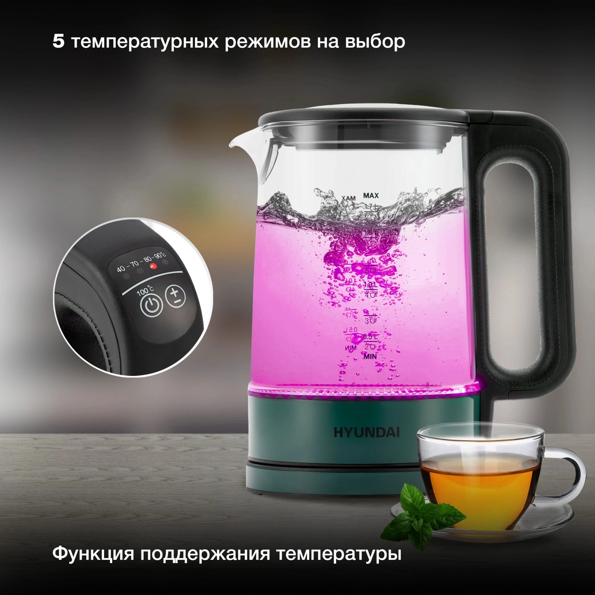 Электрический чайник Hyundai HYK-S4805 в глубоком, насыщенном темно-зеленом цвете имеет мощность в 2200 Вт и объем в 1.7 литра. Скрытый нагревательный элемент гарантирует быстрый нагрев и простоту очистки, а наличие индикатора уровня воды позволяет контролировать количество залитой воды. Фильтр от накипи обеспечивает чистоту кипяченой воды и отсутствие примесей. Hyundai HYK-S4805 оснащен интуитивно понятной панелью управления, с помощью которой вы сможете выбрать один из 5 температурных режимов, идеально подходящий для приготовления различных видов чая, кофе или других напитков. Предусмотрена удобная функция поддержания температуры, что позволит сохранить воду горячей в течение длительного времени. Одной из особенностей этой модели является красивая цветовая подсветка, которая меняется в зависимости от температуры. Оборудован звуковым сигналом, оповещающим о закипании, и функцией автоматического отключения, что обеспечивает безопасность и удобство использования. Защита от включения без воды предотвращает перегрев и гарантирует долгий срок службы, а удобная подставка с вращением на 360 градусов делает использование еще более комфортным. Кнопка открытия крышки добавляет удобства при наполнении чайника водой.