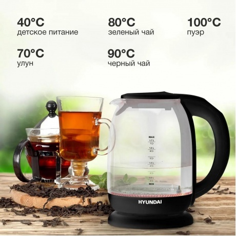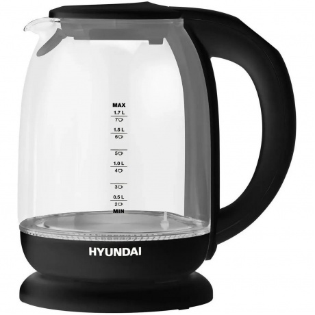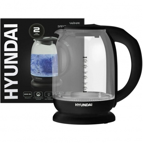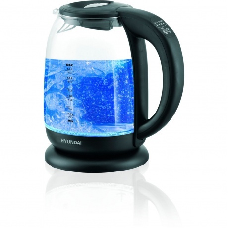 Обеспечит быстрый нагрев воды чайник HYUNDAI HYK-S3809 мощностью 2200 Вт объемом 1.7 л со скрытым нагревательным элементом. Обладает подсветкой воды, цветовая гамма которой меняется в зависимости от режима температуры (всего 5, с регулировкой). Устанавливается на вращающейся на 360 градусов подставке. Оснащен индикаторами включения и уровня воды. Фильтр в носике чайника не допускает попадания накипи в чашки. Предусмотрены функции автоматического отключения, защиты от включения без воды, поддержания температуры. Обеспечивается блокировка крышки во время нагревания и кипения воды. Открыть ее можно нажатием специальной кнопки. Предусмотрены звуковой сигнал при закипании и эффектная подсветка воды.