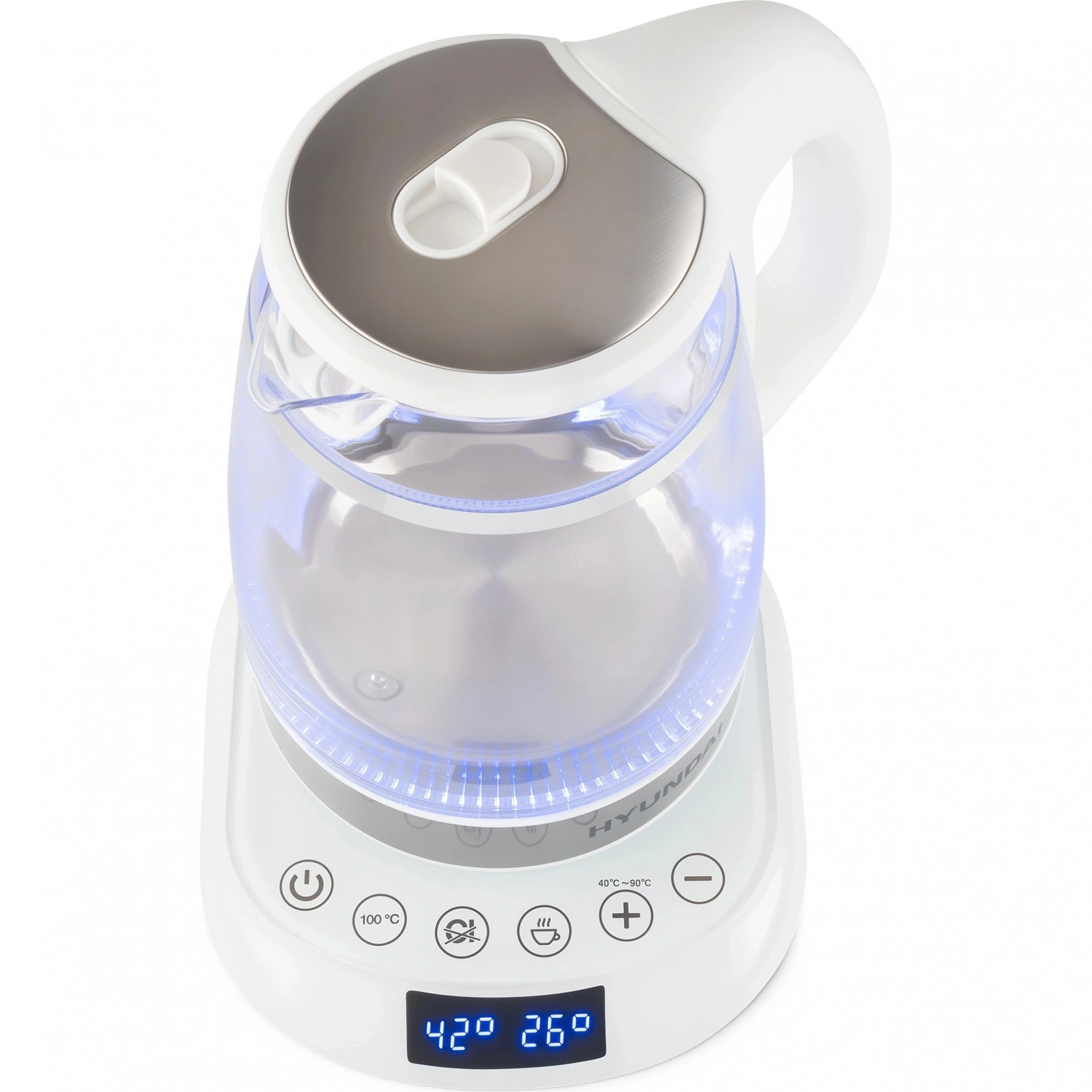 Электрический чайник Hyundai HYK-G5507 — это современный и многофункциональный прибор, который сочетает в себе стильный дизайн, высокую мощность и множество полезных функций. С максимальным объемом 1.7 литра и мощностью 2200 Вт, он быстро и эффективно справляется с нагреванием воды до нужной температуры. Двойной теплоизолированный корпус гарантирует безопасность при использовании, так как внешняя поверхность чайника выполнена из прозрачного пластика, который не нагревается, защищая вас от случайных ожогов. Внутренний корпус из боросиликатного стекла отличается высокой прочностью, устойчивостью к температурным перепадам и долговечностью. Это стекло не впитывает запахи и не изменяет цвет с течением времени, сохраняя презентабельный вид на долгие годы. Чайник оснащен 6 режимами, что позволяет подбирать нужную температуру для разных целей: от кипячения воды для чая и кофе до более низких температур для приготовления детских смесей или для разогрева жидкостей. Удобная регулировка температуры позволяет легко установить нужную настройку, а встроенный дисплей и индикатор уровня воды делают процесс использования еще более комфортным и интуитивно понятным. Один из главных плюсов модели — это фильтр от накипи, который помогает поддерживать чистоту воды. Это особенно важно для тех, кто живет в районах с жесткой водой. Дополнительные функции, такие как автоматическое отключение, защита от включения без воды и звуковой сигнал при закипании, делают устройство еще более безопасным и удобным в эксплуатации. Особое внимание стоит уделить подсветке воды, которая придает чайнику не только функциональность, но и стильный вид. Приятное синее свечение будет радовать глаз в процессе нагрева, особенно в темное время суток. Удобная крышка с кнопкой и широкий угол ее раскрытия обеспечивают легкость в заливе воды и в уходе за прибором. Также стоит отметить, что чайник стоит на подставке 360 градусов, что добавляет удобства при его использовании с любой стороны.