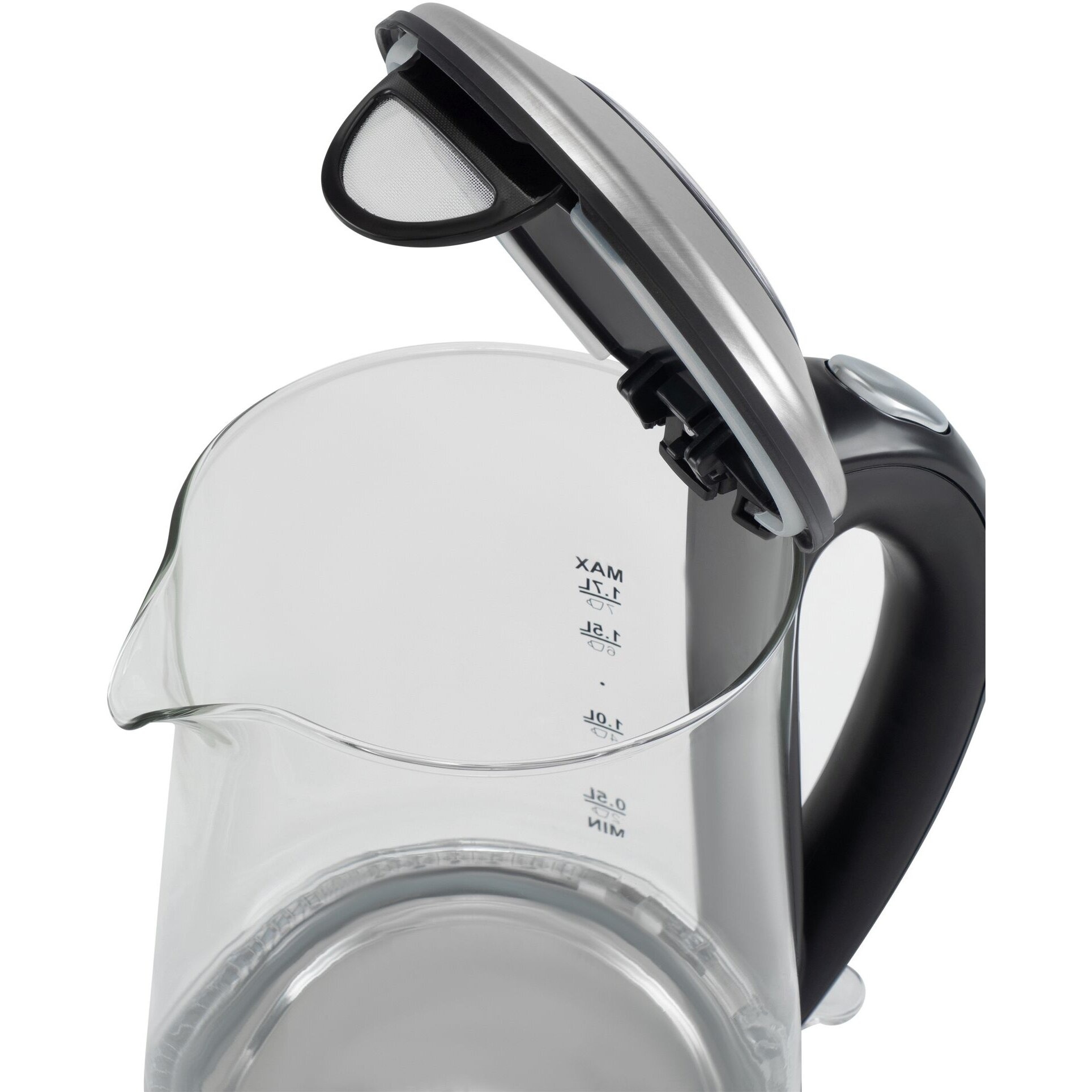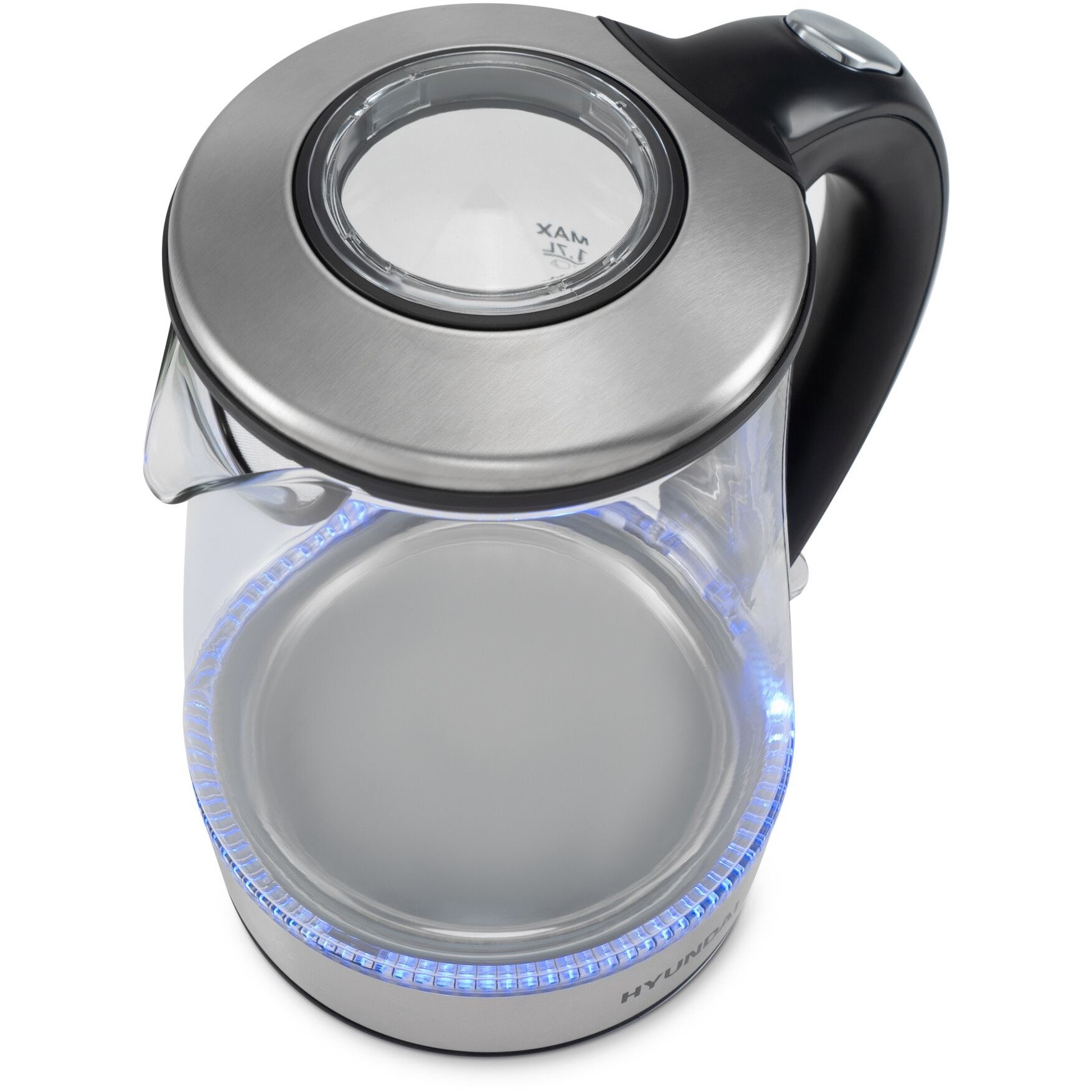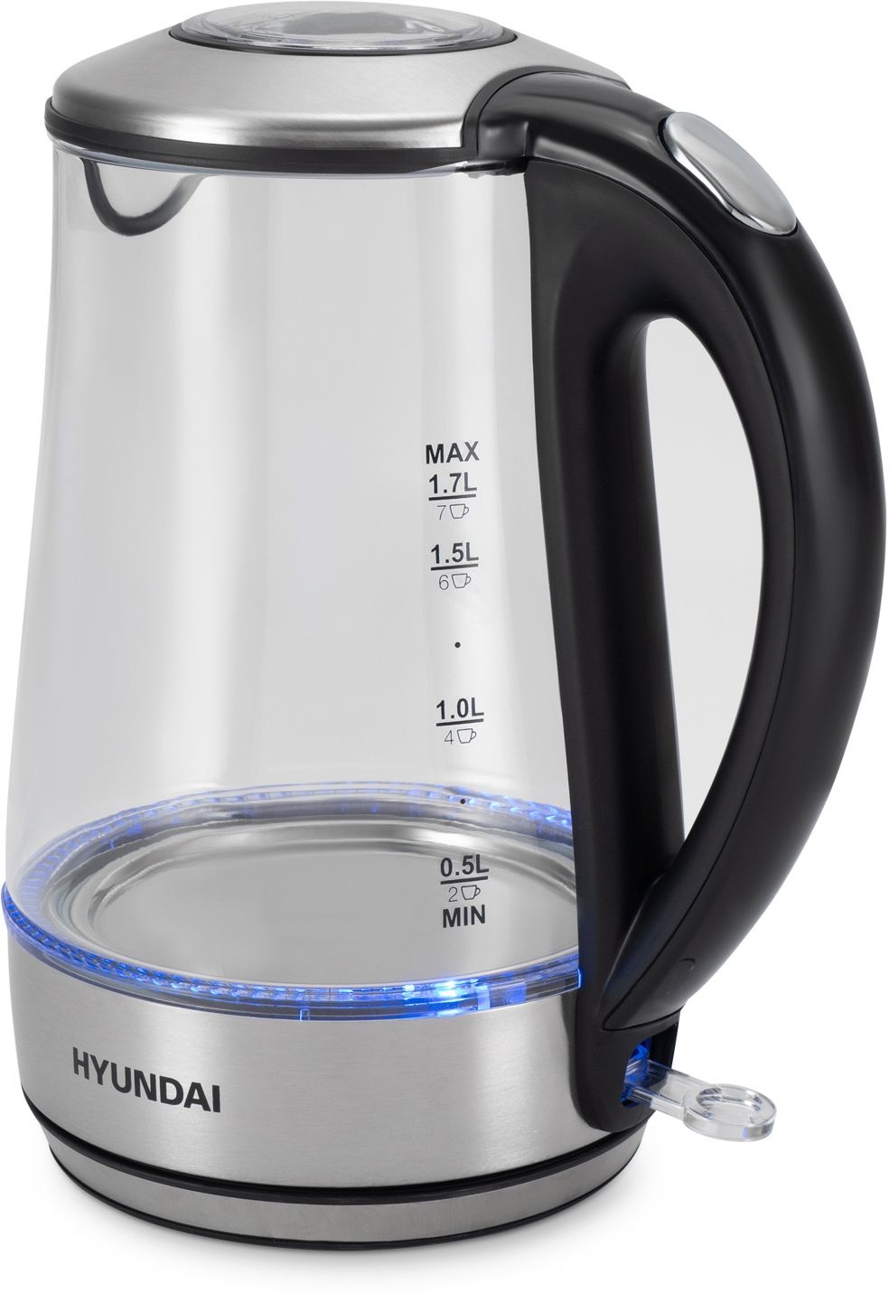 Стеклянно-металлический электрический чайник Hyundai HYK-G8406 объемом 1.7 л и мощностью 2200 Вт позволит быстро вскипятить 0.5-1.7 л воды. Модель оснащена голубой подсветкой и функцией автоматического отключения нагрева при закипании, а также встроенным фильтром от накипи.