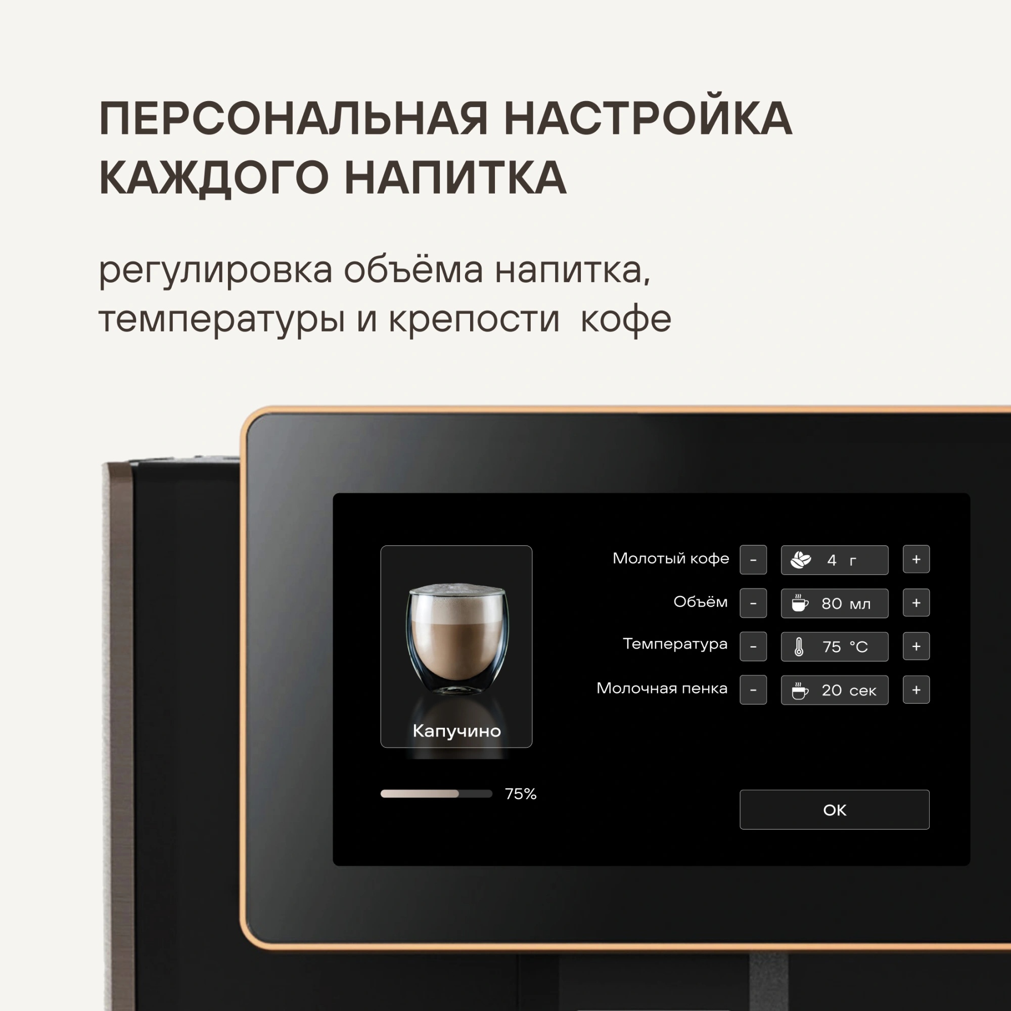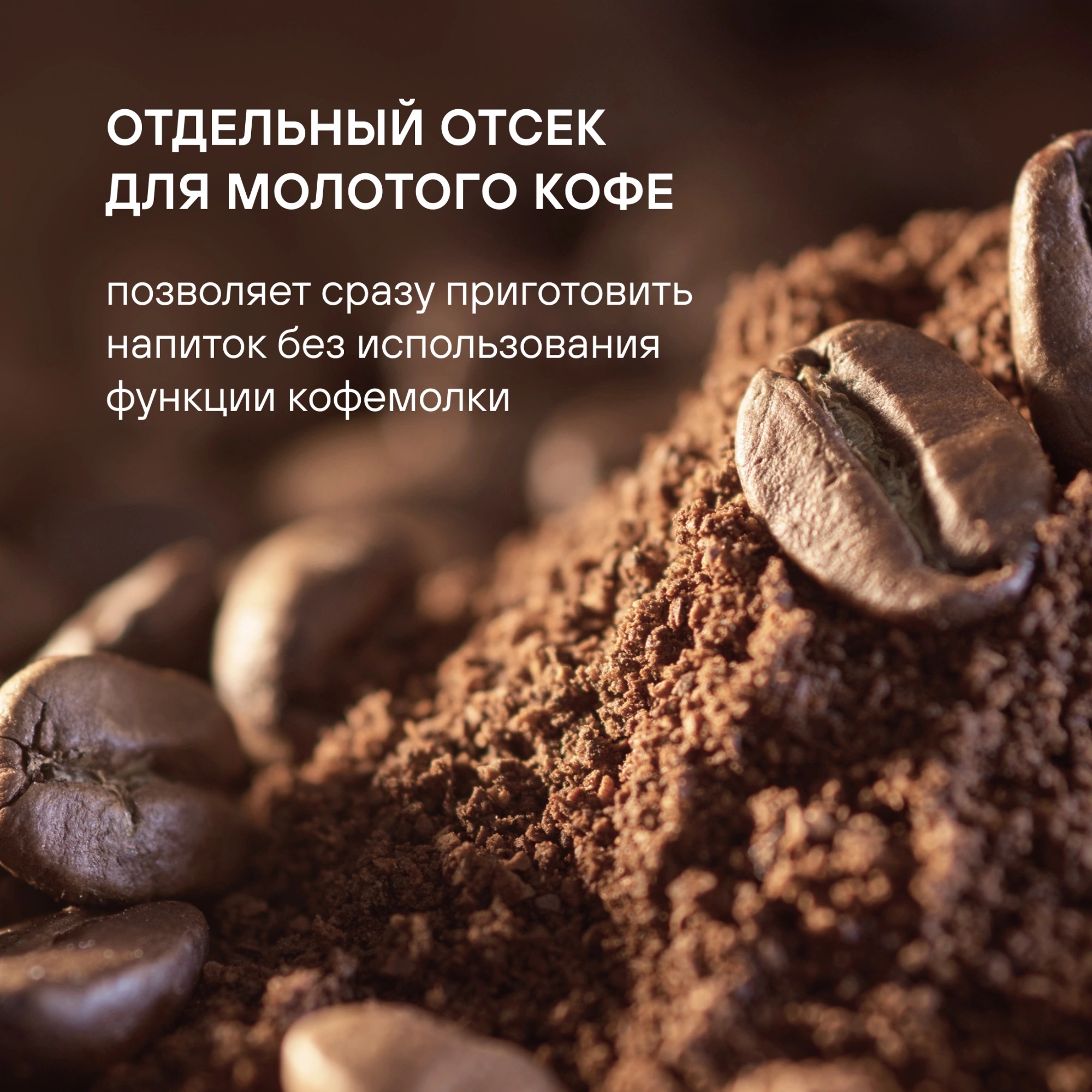 Для измельчения зерен в устройстве имеется профессиональная коническая кофемолка с контейнером на 160 г, обеспечивающая 4 степени помола. Но также предусмотрена возможность приготовления напитков из молотого кофе. Устройство даёт возможность настроить любой напиток по вашим индивидуальным предпочтениям. Вы можете регулировать количество молотого кофе, объем чашки (от 20 мл до 250 мл), степень крепости напитка и его температуру (75–95°С) по своему желанию. При этом рецепт вашего идеального кофе будет сохранен в настройках меню. В кофемашине установлен съемный резервуар для воды объемом 1800 мл.