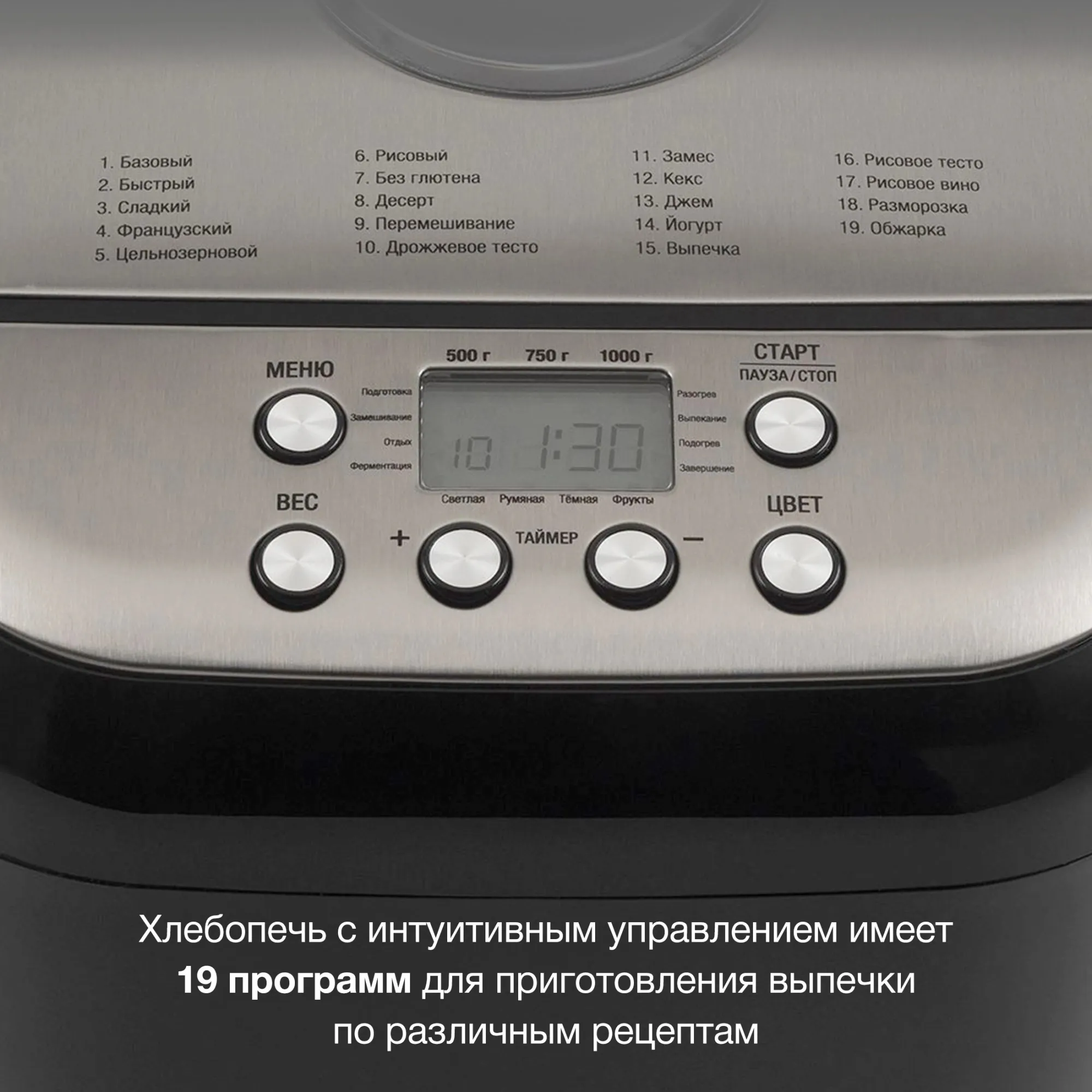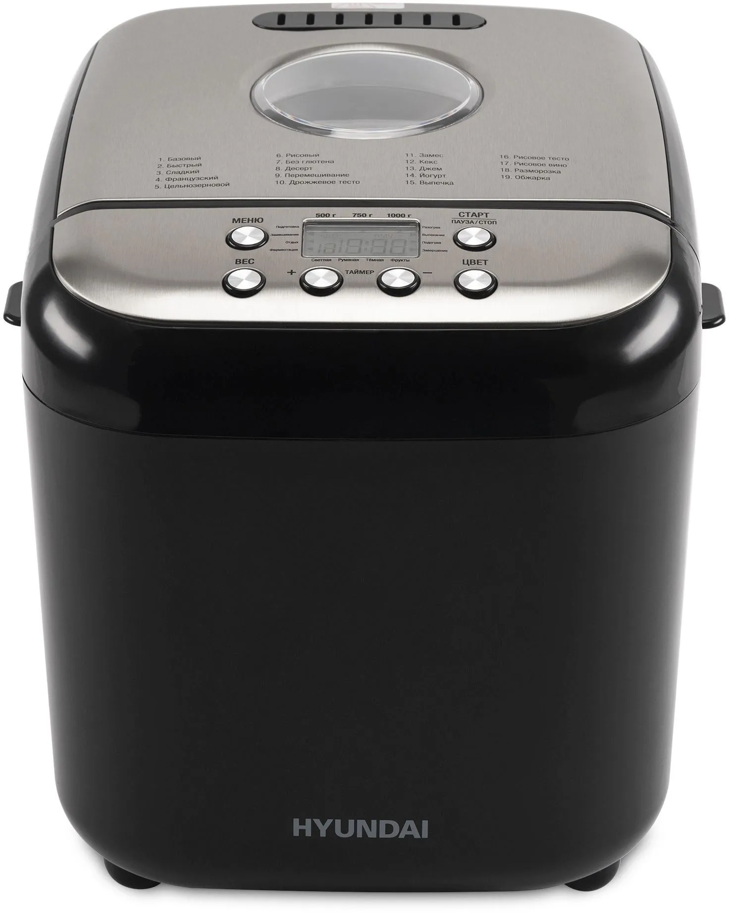 Хлебопечь Hyundai HYBM-3087 черный/серебристый, мощность 600Вт, вес выпечки до 1000г, форма выпечки буханка, программ приготовления: 19.Мерный стакан, мерная ложка, лопасть для замешивания теста, крюк для извлечения лопасти