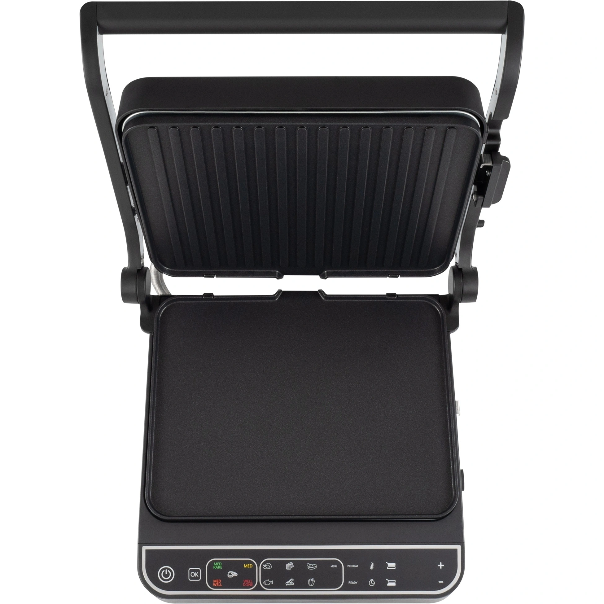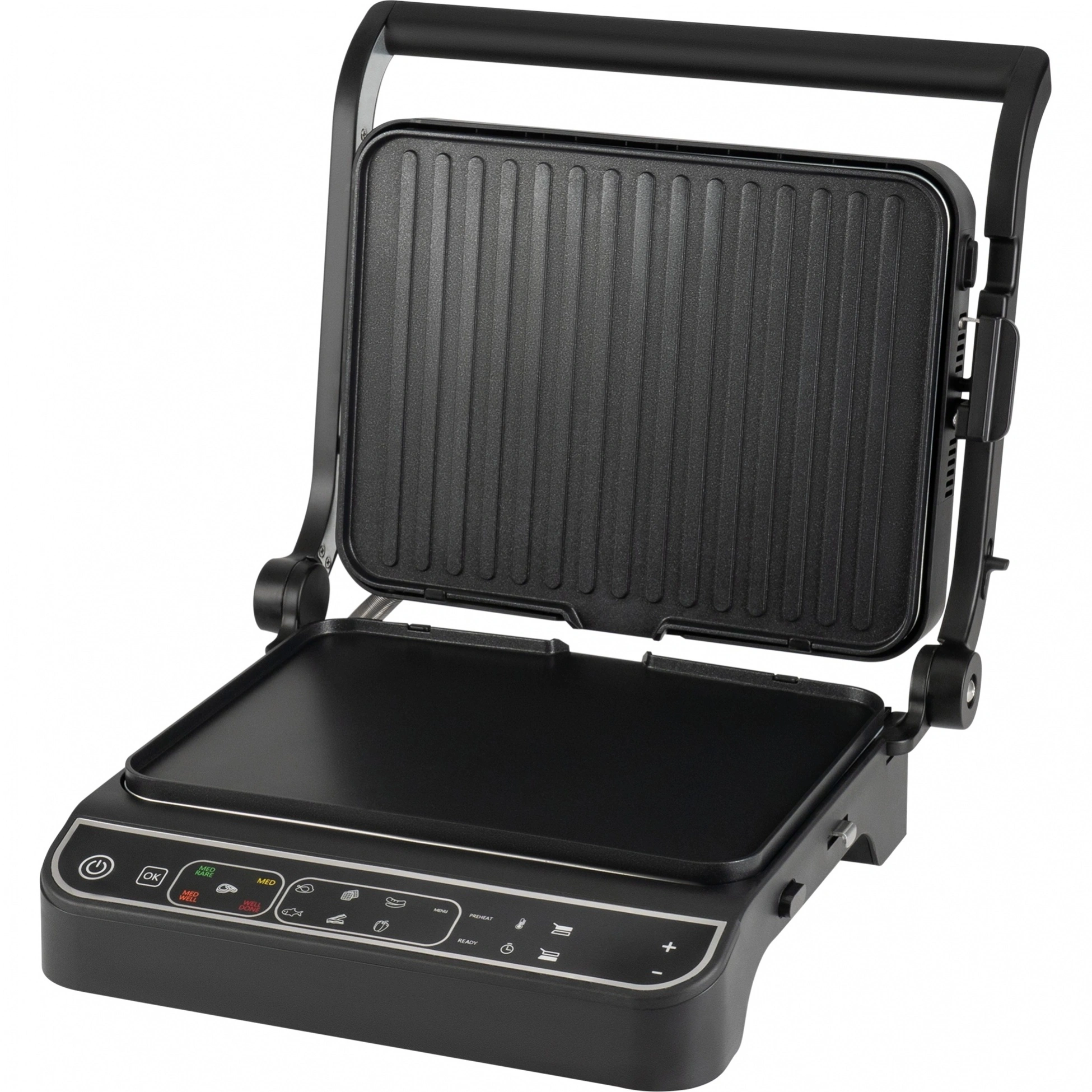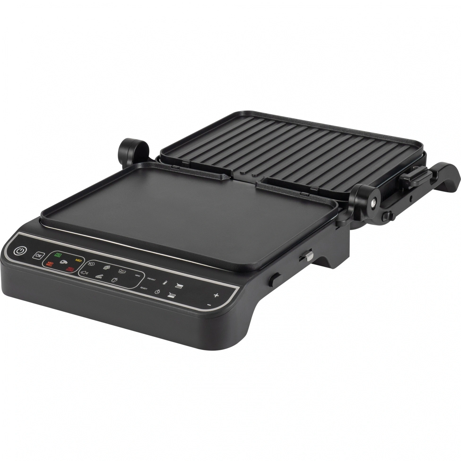 10 автоматических программ для приготовления, а так же ручной режим, для оптимальных настроек для каждого типа продуктов. Открытие на 180°, плоская панель и раздельная регулировка температуры панелей, позволяет использовать гриль как плиту.