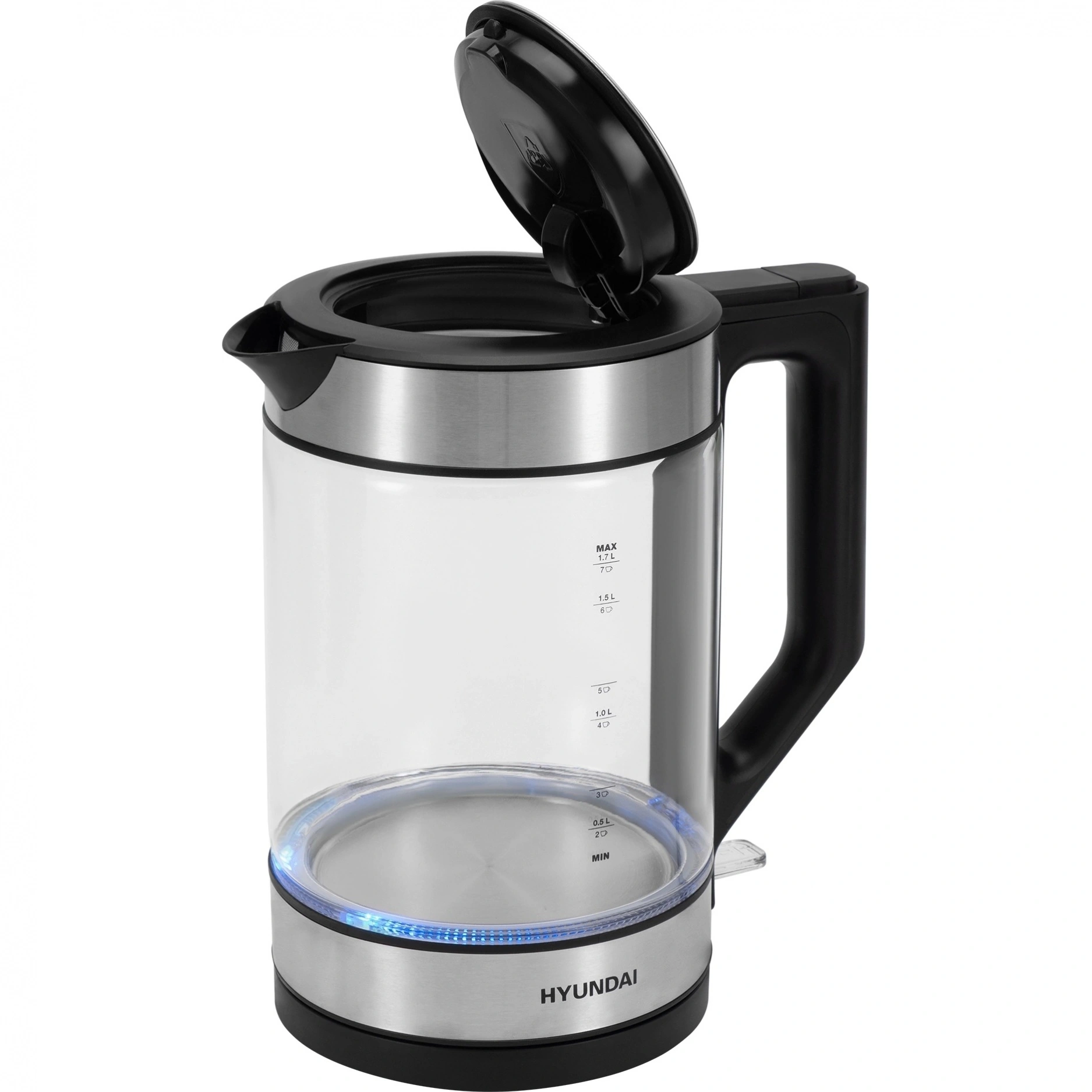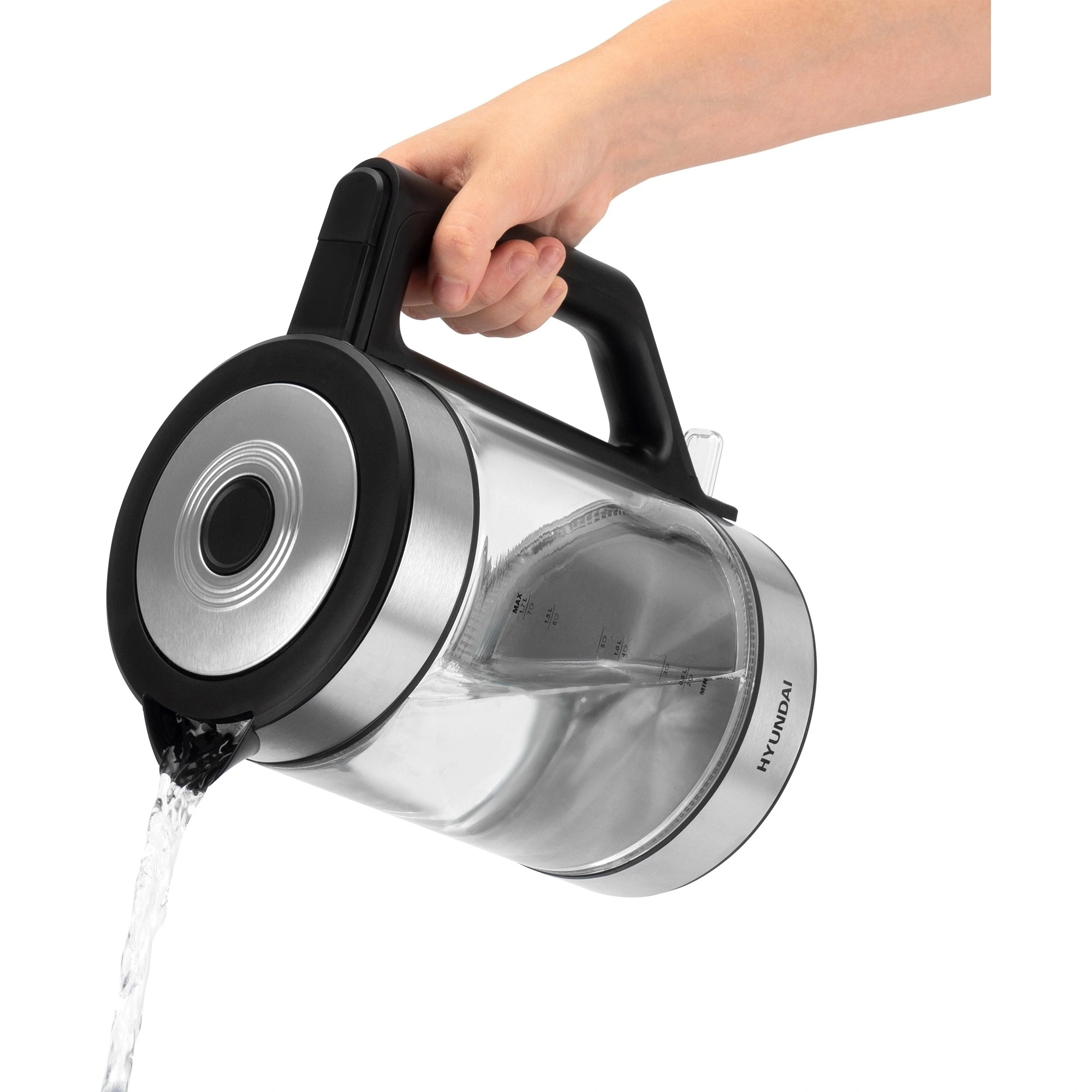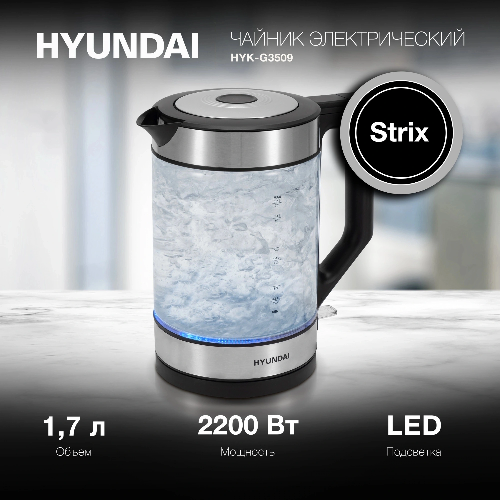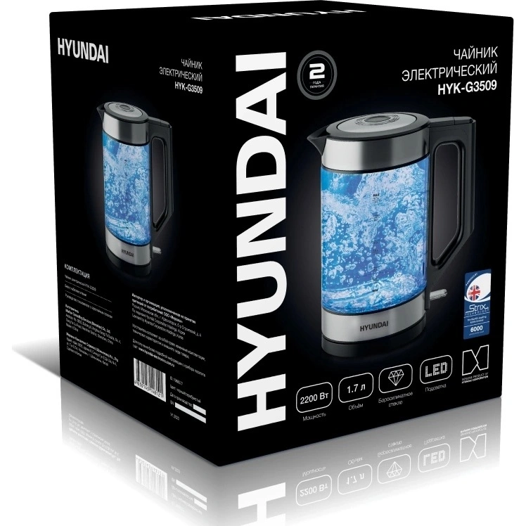 Электрический чайник Hyundai HYK-G3509 в элегантном сочетании черного матового пластика и прозрачного закаленного стекла – современный прибор, который станет не только надежным помощником на Вашей кухне, но и стильным акцентом в интерьере. Мощность в 2200 Вт гарантирует быстрый нагрев воды, а вместительный объем в 1.7 литра позволяет приготовить достаточно горячих напитков для всей семьи или компании друзей. Оснащен контрольной группой Strix(VnQ) - английским контроллером с дополнительной гарантией на 6000 циклов, что обеспечивает долгий срок службы. Скрытый нагревательный элемент способствует быстрому закипанию воды и облегчает уход за прибором. Сквозь прозрачные стенки корпуса видно количество налитой воды. Цветная подсветка выступает как индикатор работы и повышает эстетичность устройства. Hyundai HYK-G3509 оснащен фильтром от накипи, который обеспечит чистоту и превосходный вкус каждого напитка. Автоматическое отключение и защита от включения без воды гарантируют безопасность использования. Удобная подставка с вращением на 360 градусов и кнопка открытия крышки создают дополнительный комфорт при ежедневной эксплуатации.