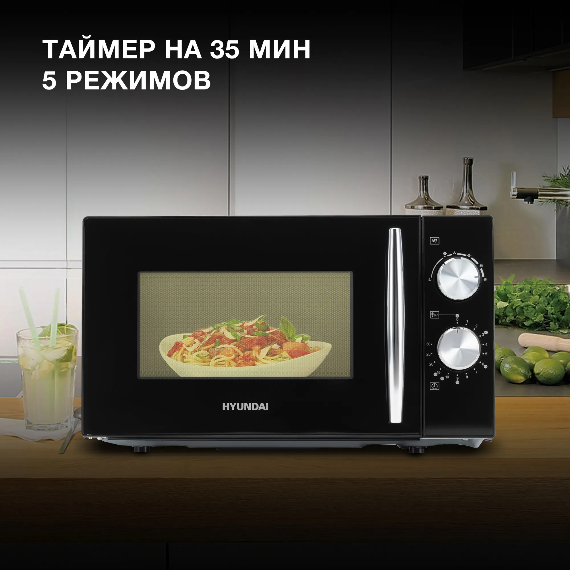 Современная микроволновая печь Hyundai HYM-M2050 быстро и эффективно разогревает пищу, а также имеет интуитивное управление. Вместимость прибора составляет 20 л – этого объёма достаточно даже для крупных блюд, рассчитанных на несколько персон. Максимальная мощность печи – 700 Вт, поэтому даже с максимальной загрузкой она отлично справляется. Все регулировки в данной модели выполняются с помощью механики. В том числе и переключение режимов готовки. Среди них разморозка и пять различных вариаций силы нагрева. Таким же образом можно поменять и время обработки. Над некоторыми значениями времени специально проставлены белые числа в кг – это рекомендуемый интервал для подготовки указанного веса продукта к дальнейшей термической обработке. Всего органов управления у Hyundai HYM-M2050 два: первый – колесо выбора мощности, второй – аналогичная деталь, но для установки времени. СВЧ-печь Hyundai HYM-M2050 изготовлена в лаконичном и минималистичном чёрном дизайне. Дверь устройства открывается посредством лёгкого потягивания на себя единственной её ручки. Собрано устройство надежно и из самых качественных комплектующих.