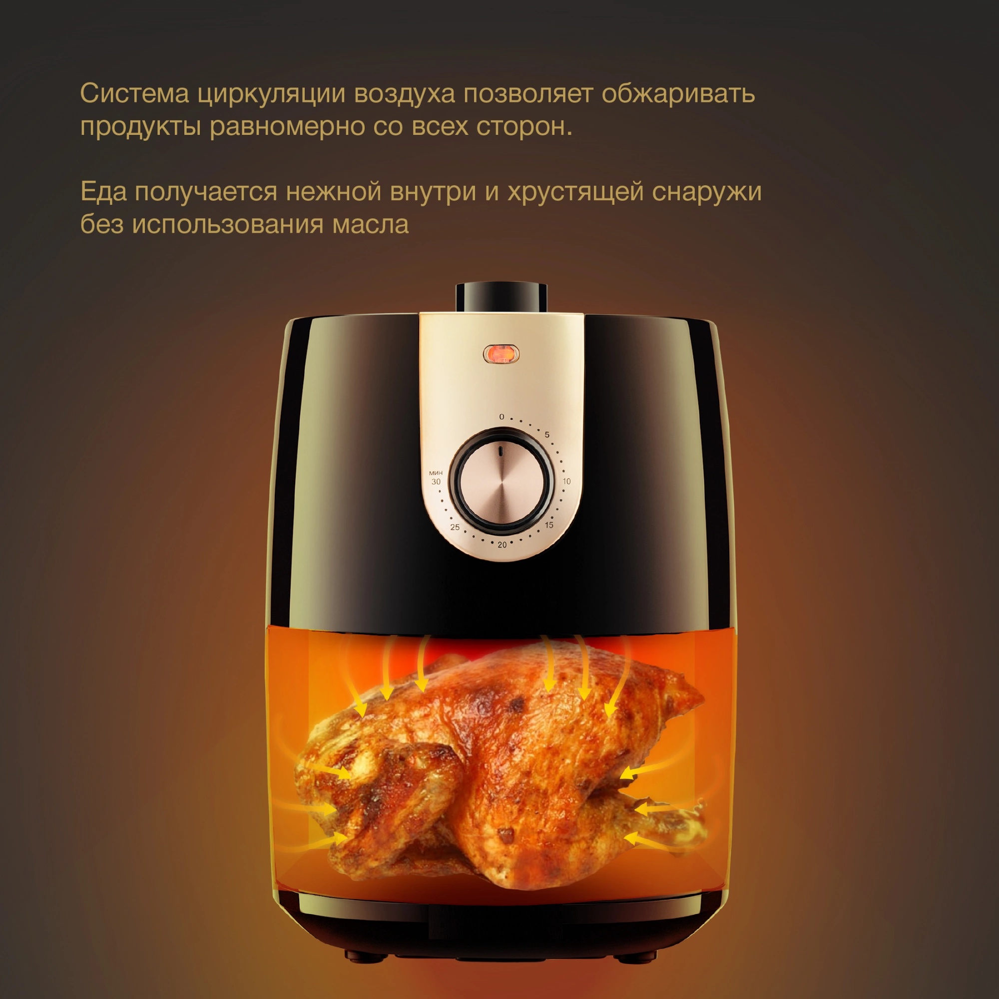 Корзина прибора, в которой происходит термическая обработка, выполнена из антипригарного материала – тефлон. Она полностью снимается и легко моется в обычной теплой воде с губкой и жидким гелем. Еда в ней равномерно нагревается благодаря равномерному обдуву тёплым воздухом со всех сторон – конвекции. Полный объём тары составляет 3.5 л.