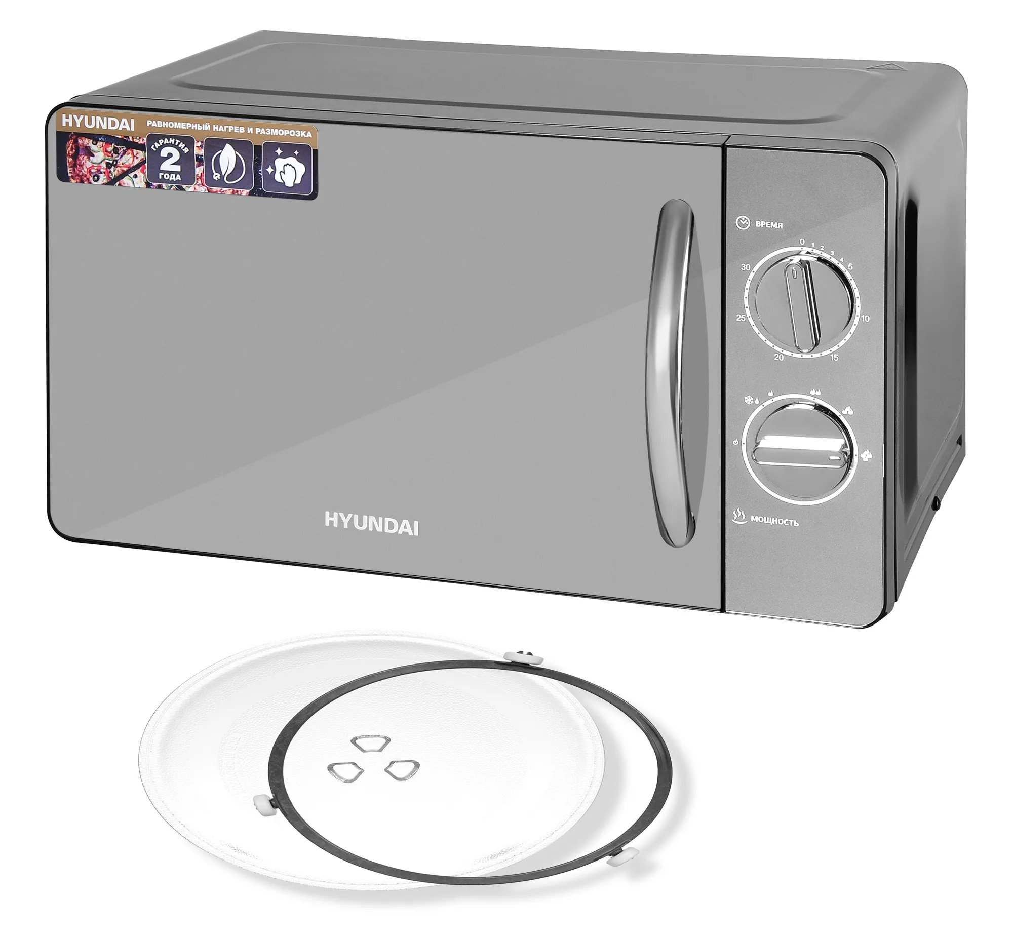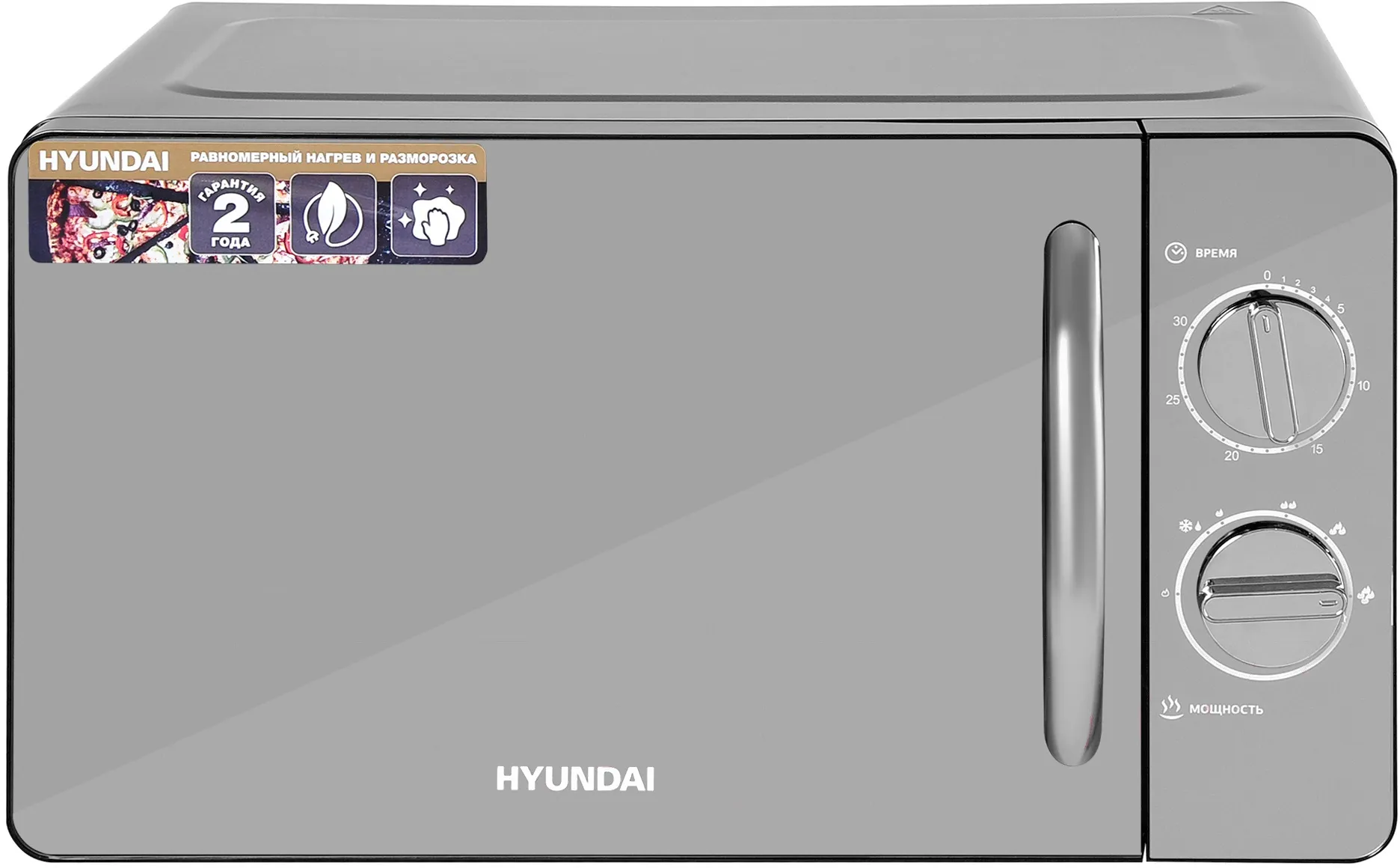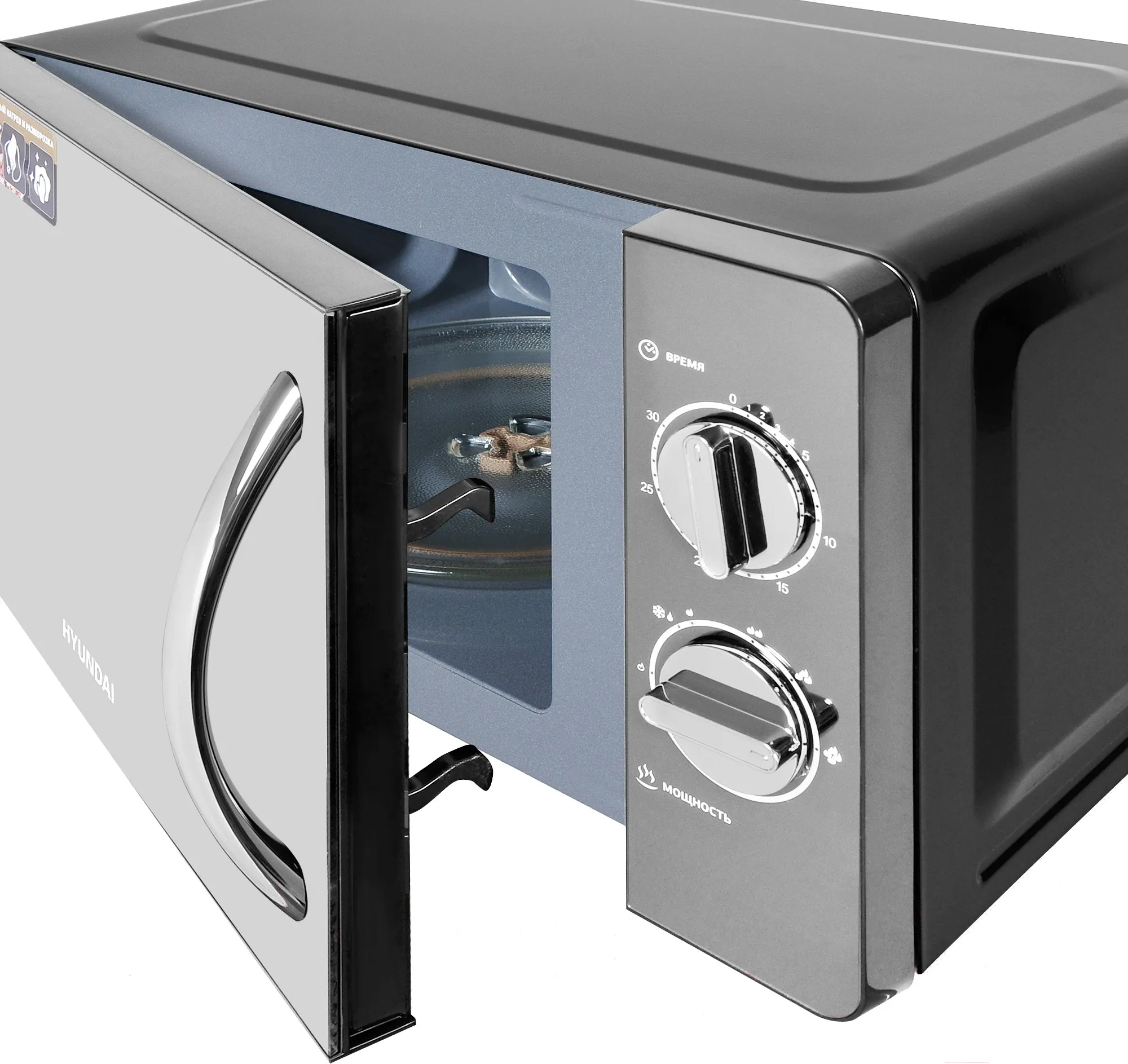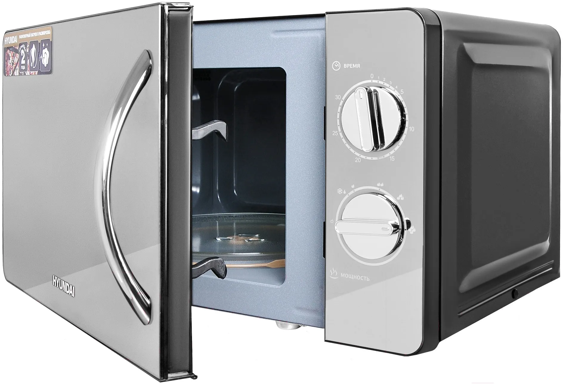 СВЧ Hyundai HYM-M2007 отличается стильным внешним видом. Фронтальная поверхность полностью зеркальная. Несмотря на это, за ней очень легко ухаживать. Лаконично впишется в любой интерьер и станет акцентом в современных стилистических решениях. Металлический корпус окрашен в черный цвет. Дверка открывается мягко, с помощью ручки серебристого оттенка. Внутренняя поверхность покрыта специальной эмалью, за которой просто ухаживать. При помощи поворотных переключателей легко управлять режимами. Выбираются время и мощность. После завершения процесса звучит приятный звуковой сигнал. Устройство подходит для подогрева уже готовой пищи и размораживания продуктов. Эти основные функции наиболее востребованы при эксплуатации микроволновых печей. Потребителю не приходится переплачивать за лишний функционал.
