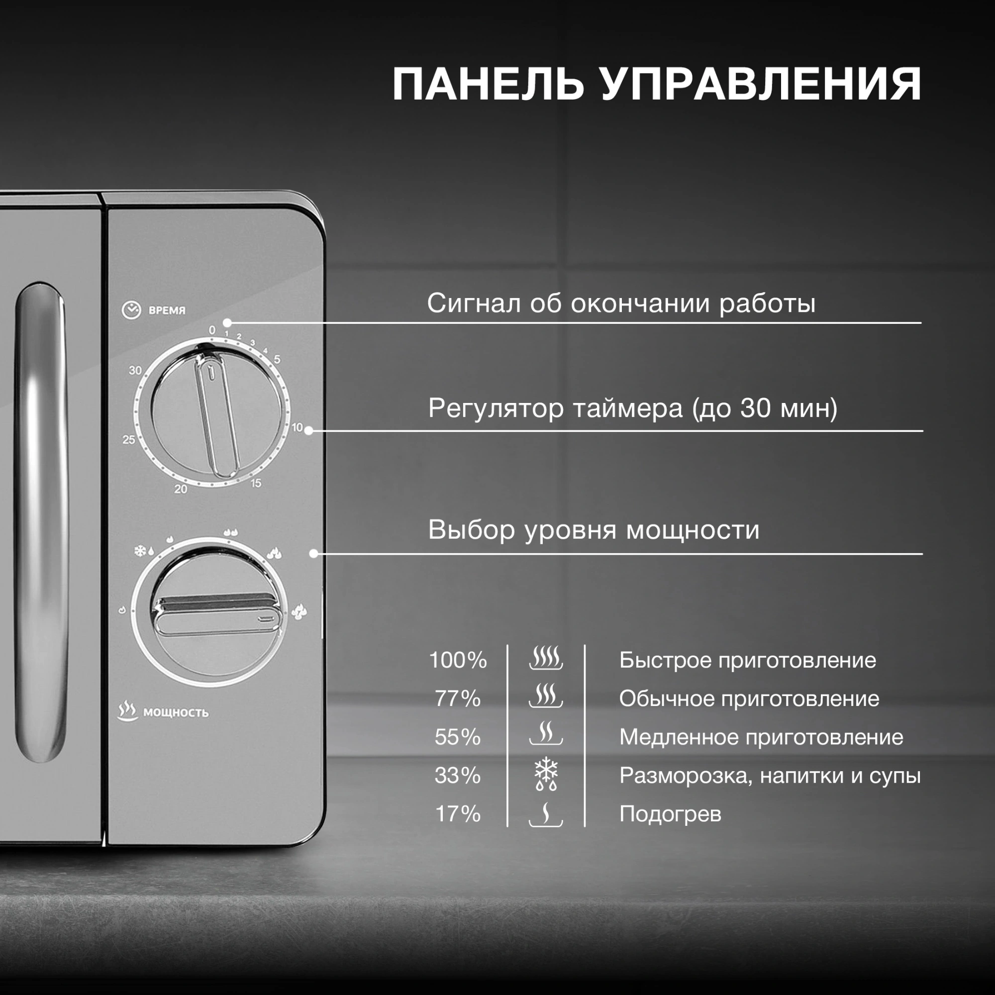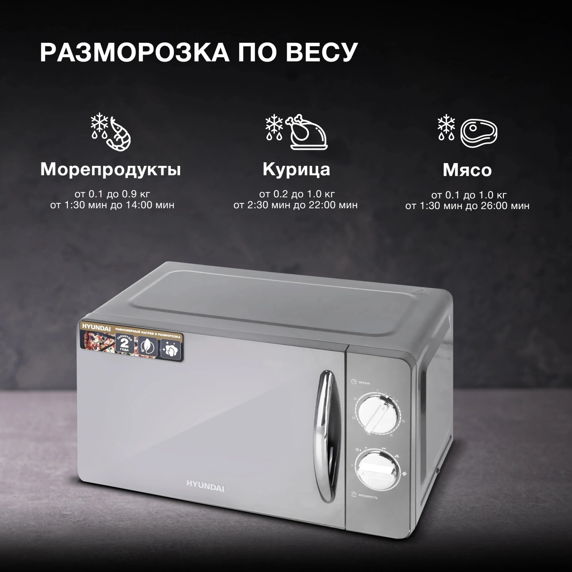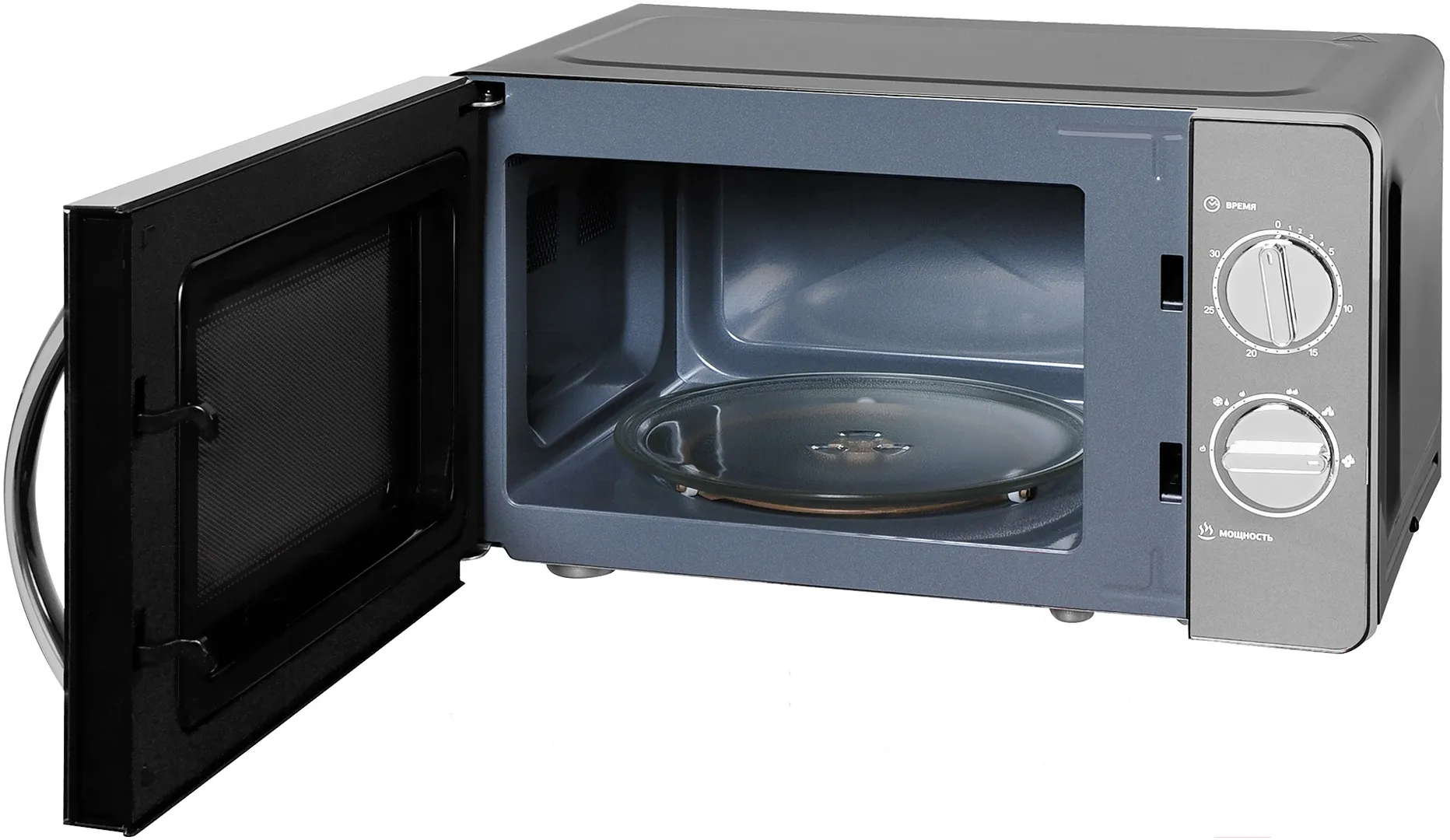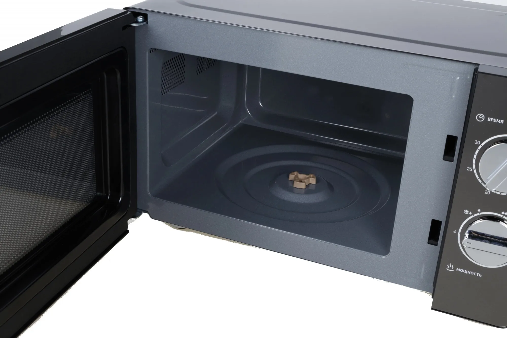 СВЧ Hyundai HYM-M2007 отличается стильным внешним видом. Фронтальная поверхность полностью зеркальная. Несмотря на это, за ней очень легко ухаживать. Лаконично впишется в любой интерьер и станет акцентом в современных стилистических решениях. Металлический корпус окрашен в черный цвет. Дверка открывается мягко, с помощью ручки серебристого оттенка. Внутренняя поверхность покрыта специальной эмалью, за которой просто ухаживать. При помощи поворотных переключателей легко управлять режимами. Выбираются время и мощность. После завершения процесса звучит приятный звуковой сигнал. Устройство подходит для подогрева уже готовой пищи и размораживания продуктов. Эти основные функции наиболее востребованы при эксплуатации микроволновых печей. Потребителю не приходится переплачивать за лишний функционал.