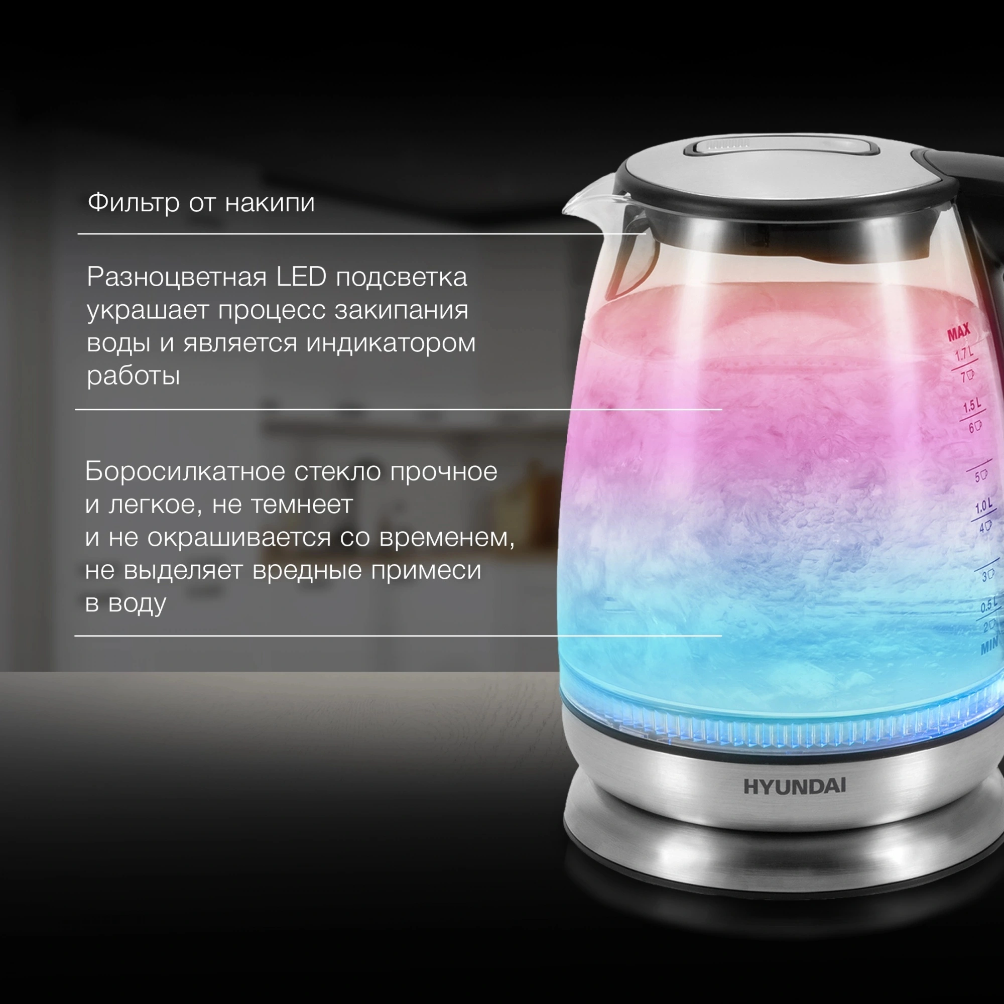 Электрический чайник Hyundai HYK-G8800, выполненный в эффектном сочетании черного корпуса и серебристых акцентов, этот чайник станет стильным дополнением интерьера вашей кухни. Мощность в 2200 Вт гарантирует быстрое закипание воды, а объем в 1.7 литра позволяет приготовить напитки для всей семьи или небольшой компании. Особенностью этой модели является корпус из радужного стекла, которое переливается различными оттенками в зависимости от освещения, в сочетании с подсветкой. Скрытый нагревательный элемент способствует быстрому нагреву и упрощает уход за устройством. Hyundai HYK-G8800 оснащен индикатором уровня воды, позволяющим точно контролировать количество наливаемой жидкости, и фильтром от накипи, гарантирующим чистоту и превосходный вкус каждого напитка. Автоматическое отключение и защита от включения без воды повышают безопасность эксплуатации. Чайник снабжен кнопкой открытия крышки и подставкой с вращением на 360 градусов.