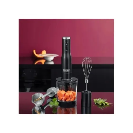 Блендерный набор RDE-1301 с максимальной мощностью 1200 Вт позволит вам готовить с удовольствием и добиваться впечатляющих кулинарных результатов. Благодаря DC-мотору прибор работает тихо: им можно пользоваться даже в утренние и вечерние часы. Рабочие лезвия с титановым покрытием и погружная часть блендера изготовлены из надежной нержавеющей стали, что гарантирует безупречную работу устройства на долгие годы. Прибор способен не только измельчать ингредиенты, но и взбивать кремы, муссы или коктейли – для этого в комплекте имеется специальная насадка-венчик. В устройстве предусмотрен режим TURBO — для самых твердых или плотных продуктов. Скорости переключаются плавно благодаря специальному регулятору. В набор входят рабочая чаша объемом 500 мл и стакан для смешивания объемом 1000 мл с крышкой. Корпус прибора имеет противоскользящее покрытие для комфортного использования.