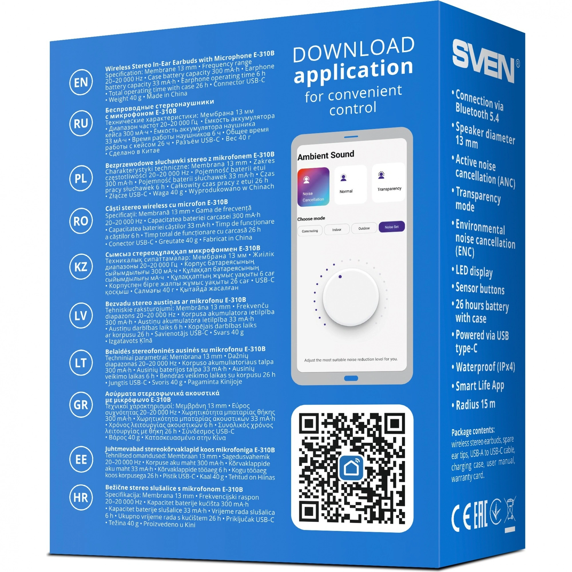 SVEN E-310B поддерживают управление через ПО Smart Life, предлагаемое в версиях для устройств под управлением iOS и Android. С его помощью можно полностью управлять гарнитурой, используя удобный и понятный интерфейс – все настройки всегда под рукой в смартфоне пользователя.
