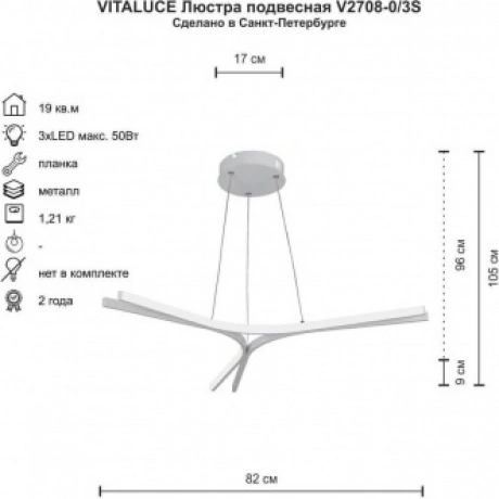 светодиодная люстра v2708-0/3s мощностью 50 вт с цветовой температурой 4000к и световым потоком 4940 лм обеспечивает яркое и равномерное освещение, подходит для помещений площадью до 19 кв.м, имеет три лампы и современный дизайн