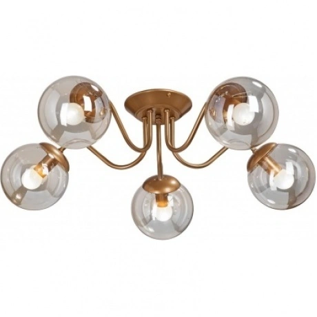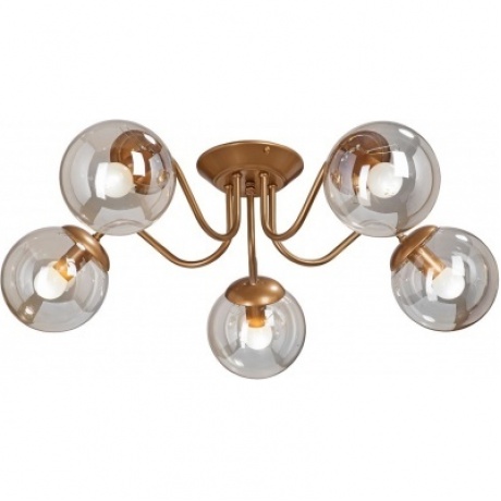 потолочная люстра с 5 плафонами и цоколями e14, максимальная мощность 200 вт (5х40 вт), рабочее напряжение 220в. металлический каркас бронзового цвета со стеклянными элементами, предназначена для освещения помещений площадью до 10-11 м?. стиль ар-деко подходит для классических и современных интерьеров.