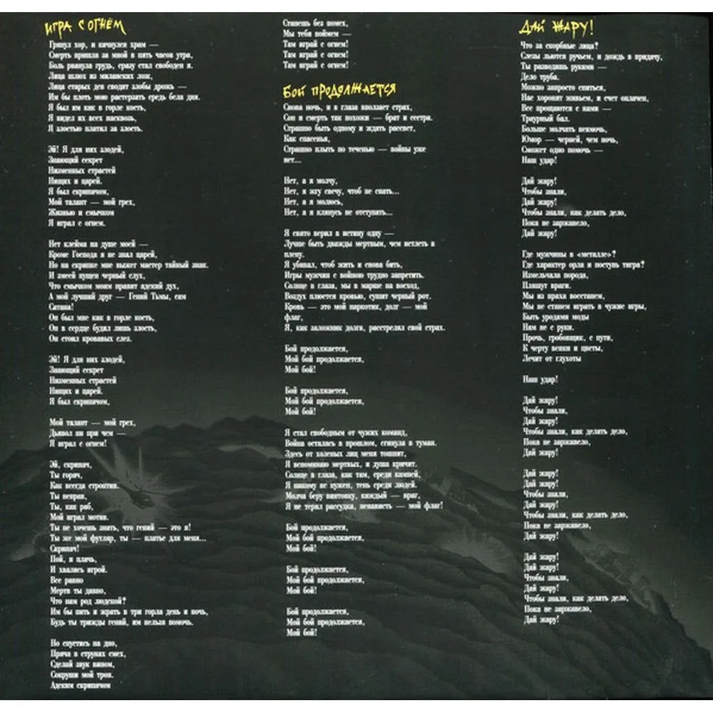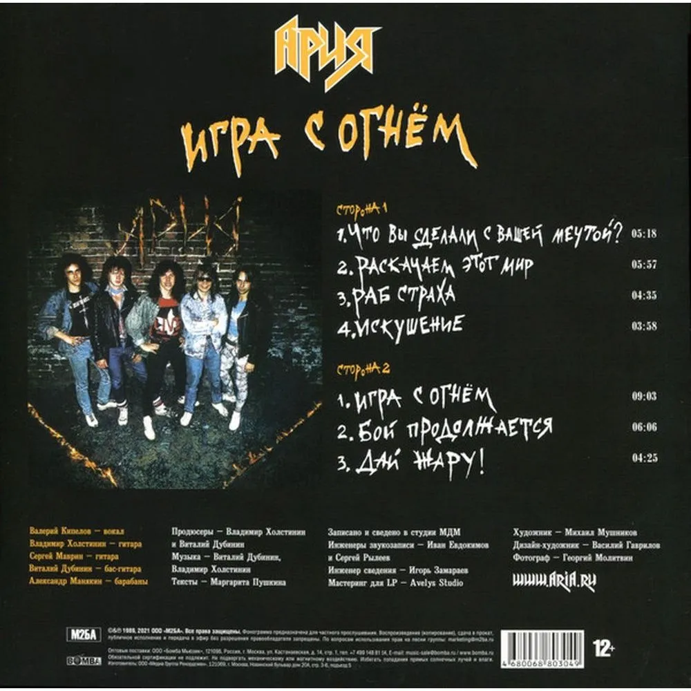 Группа Ария приступила к переизданию дискографии своих номерных альбомов на виниле. "Игра С Огнём" - студийный альбом группы Ария, выпушенный в 1989 году. Альбом выпущен "арийцами" после расставания с директором группы Виктором Векштейном. Второй альбом группы, выпущенный фирмой Мелодия на грампластинках. Ария - советская и российская хеви-метал-группа. Одна из самых успешных российских рок-групп, при этом - это одна из немногих российских метал-групп, достигших серьёзного коммерческого и творческого успехов и популярности за пределами поклонников хэви-метала. Лауреат премии Fuzz 2007 года как лучшая live-группа. Её бывшими участниками были образованы многие другие известные группы (Мастер, Кипелов, Маврин, Артерия, Артур Беркут), которые вместе составляют плеяду, называемую Семейкой Арии.Большая часть текстов группы написана Маргаритой Пушкиной, а музыки - Виталием Дубининым и основателем группы Владимиром Холстининым.