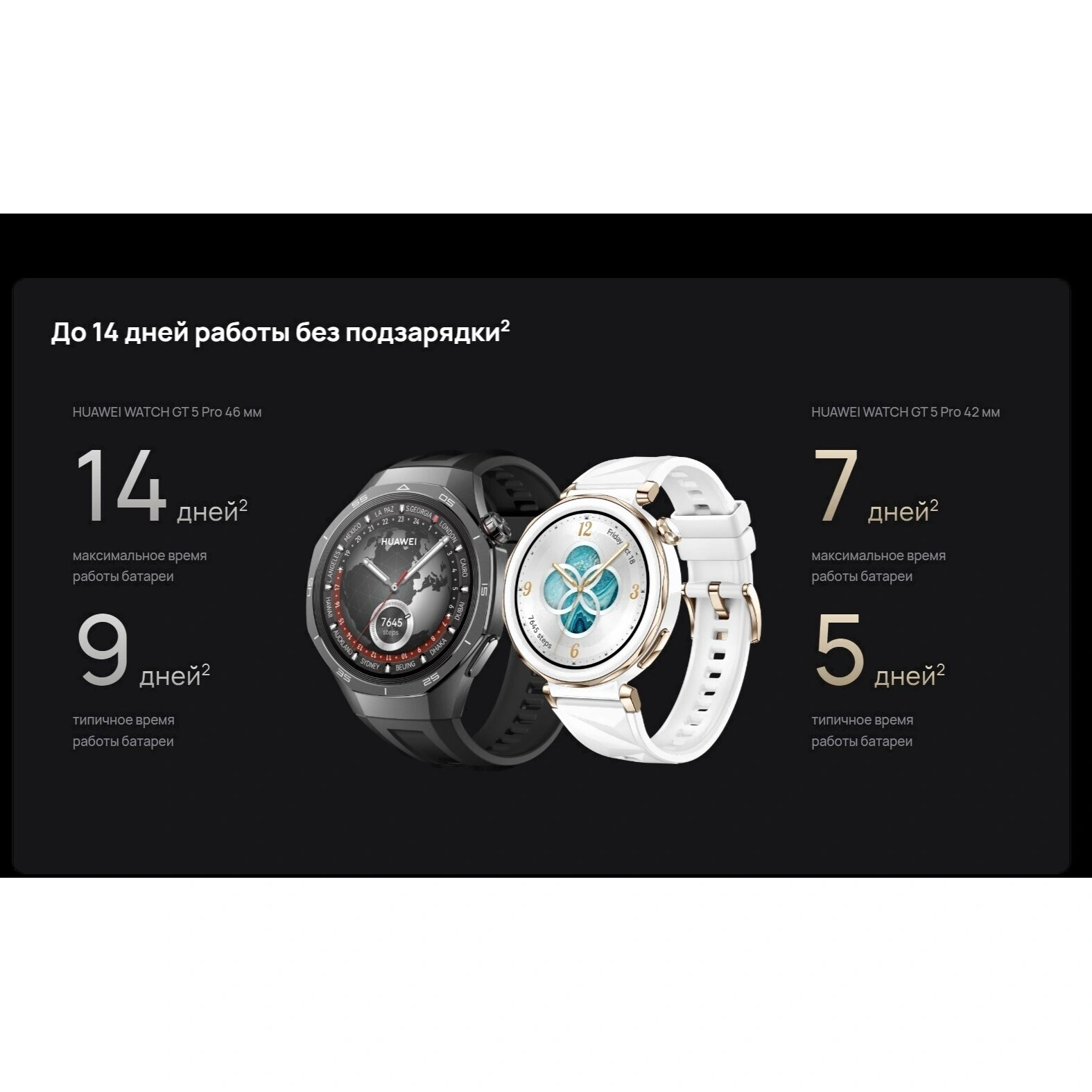 Смарт-часы HUAWEI WATCH GT5 Pro классом водонепроницаемости 50 м и энергоемкой батареей, способной держать заряд до 7 дней. Они поддерживают широкий набор функций для мониторинга физических нагрузок и здоровья, а также для повседневного использования. Они подойдут как для работы с рутинными задачами, так и для тренировок профессионального уровня.