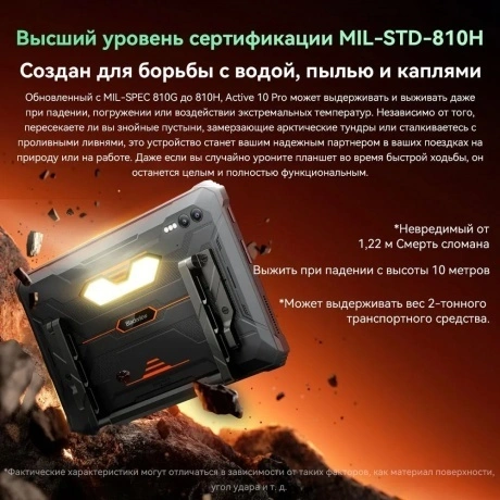 Blackview Active 10 Pro — это защищенный планшет с большим экраном и мощным процессором, который обеспечивает высокую производительность и быструю работу системы. Устройство имеет яркий и чёткий дисплей 10.95 с разрешением 1920x1200 пикселей, который обеспечивает отличное качество изображения. Планшет работает на операционной системе Android 14 c фирменной оболочкой Doke OS_P 4.0 которая предоставляет пользователю широкий спектр функций и возможностей. Blackview Active 10 Pro имеет двойную основную камеру с инфракрасной подсветкой 108+20 Мп, которая позволяет делать качественные снимки и записывать видео в разрешении 2К. Устройство оснащено аккумулятором емкостью 30000 мАч, что позволяет использовать планшет длительное время без подзарядки.