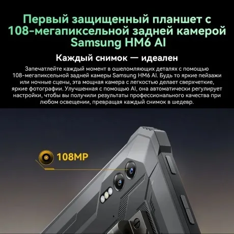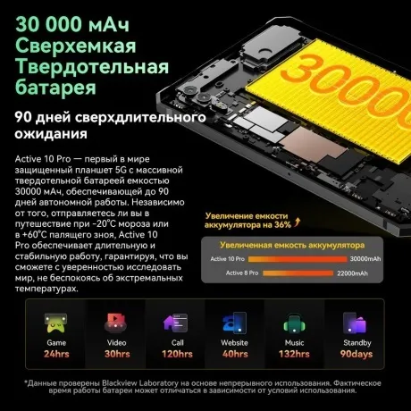 Blackview Active 10 Pro — это защищенный планшет с большим экраном и мощным процессором, который обеспечивает высокую производительность и быструю работу системы. Устройство имеет яркий и чёткий дисплей 10.95 с разрешением 1920x1200 пикселей, который обеспечивает отличное качество изображения. Планшет работает на операционной системе Android 14 c фирменной оболочкой Doke OS_P 4.0 которая предоставляет пользователю широкий спектр функций и возможностей. Blackview Active 10 Pro имеет двойную основную камеру с инфракрасной подсветкой 108+20 Мп, которая позволяет делать качественные снимки и записывать видео в разрешении 2К. Устройство оснащено аккумулятором емкостью 30000 мАч, что позволяет использовать планшет длительное время без подзарядки.