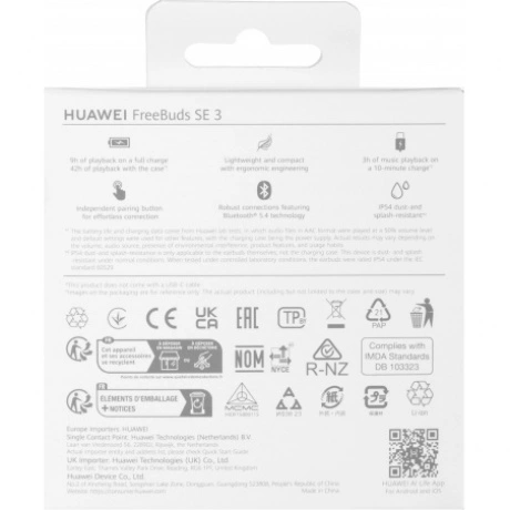 Беспроводные наушники HUAWEI FreeBuds SE 3 — это TWS Bluetooth-наушники с зарядным чехлом. Они относятся к наушникам полуоткрытого типа и обеспечивают комфорт при ношении. HUAWEI FreeBuds SE 3 поддерживают подключение к Bluetooth-устройствам, таким как телефоны и планшеты, для выполнения голосовых вызовов и воспроизведения аудио. Наушники оснащены динамическим излучателем 10 мм и микрофоном, обеспечивающим качественное шумоподавление во время вызовов. Благодаря высокой энергоэффективности и батарее емкостью 41 мАч они обеспечивают длительное время автономной работы при использовании совместно с зарядным чехлом.