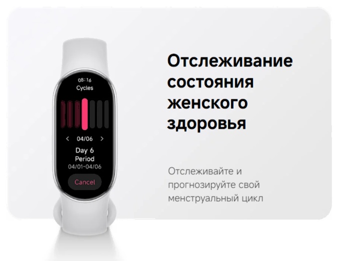 мониторинг сердечного ритма (ЭКГ), мониторинг уровня кислорода в крови, мониторинг сна, мониторинг уровня стресса, женский календарь, дыхательные упражнения, мониторинг передвижения, персональный индекс активности, мониторинг физической активности