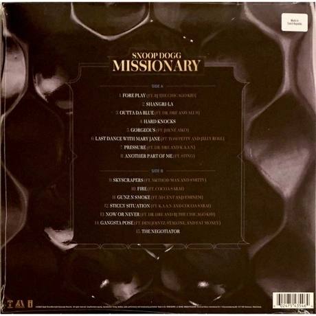 Snoop Dogg - Missionary (coloured) (0602475435464) виниловая пластинка - характеристики и описание, фото и цены представлены на карточке товара. Для того чтобы купить товар по цене 3761 руб., вам надо позвонить по телефону 8(812)426-98-99 в Санкт-Петербурге, или оформить покупку в личном кабинете.