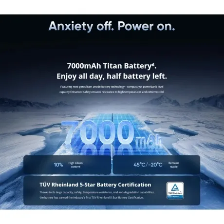Смартфон оснащен флагманским процессором MediaTek D9400e. Благодаря техпроцессу 4 нм от TSMC, производительным ядрам Cortex-X4 и Cortex-A720, а также графическому ядру Immortalis-G720, realme GT 7 набирает более 2 млн баллов в тесте производительности Antutu, оставаясь высокоэнергоэффективным. В смартфоне установлены 12 ГБ оперативной памяти стандарта LPDDR5X и 512 ГБ накопитель стандарта UFC 4.0.