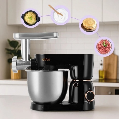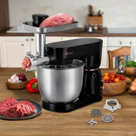 Планетарный миксер «2 в 1» КТ-4426 поможет вам смешать ингредиенты, взбить яичный белок или сливки, приготовить картофельное пюре, соус, крем, мусс, замесить жидкое тесто для блинов и крутое для пирогов. Также он может перемолоть мясо на фарш.
