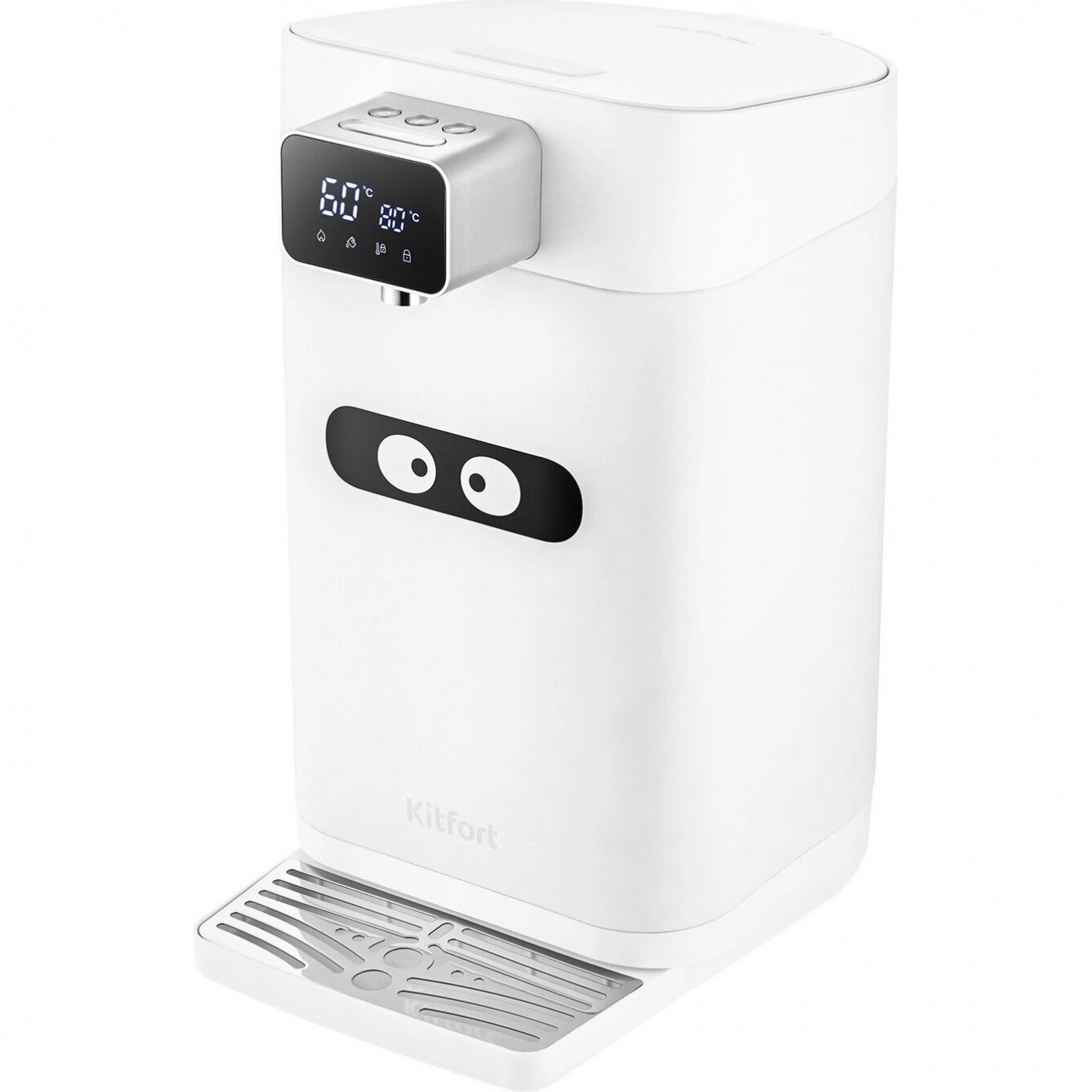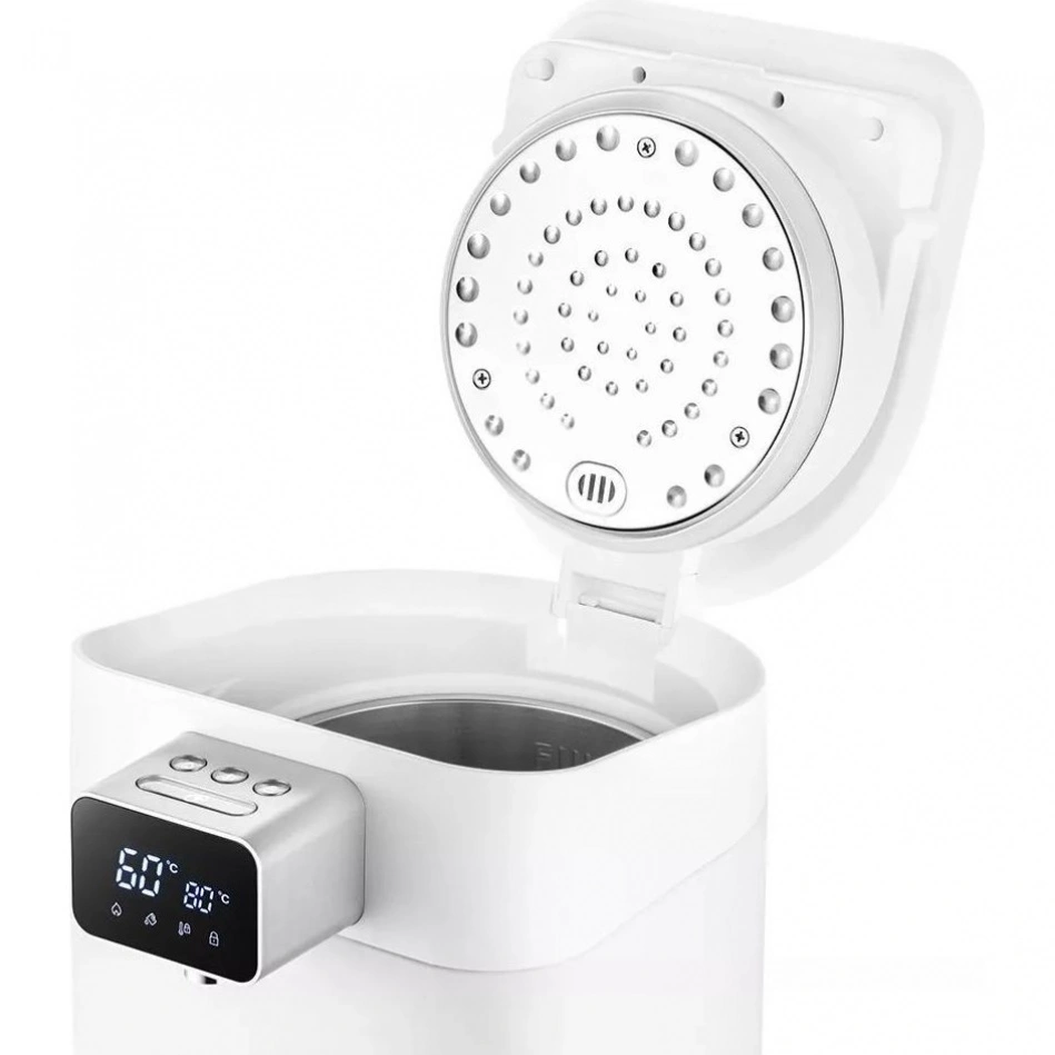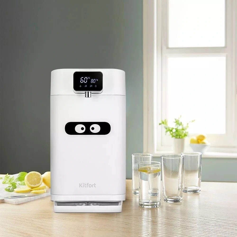 Термопот Kitfort КТ-2515 устройство, поддерживающее горячую температуру питьевой воды с помощью периодического нагрева. Встроенный термодатчик будет держать заданную температуру диапазоне от 45 °C до 95 °C или доведет воду до кипения. С помощью кнопок управления на верхней панели вы сможете задать нужную температуру, включить кипячение, а также заблокировать панель управления. Подача воды происходит нажатием на большую кнопку. Вся панель управления оборудована белой подсветкой. Термопот оборудован LED дисплеем на передней панели над носиком, где отображается заданная и текущая температура воды в резервуаре. Индикация в нижней части дисплея поможет определить в каком режиме работает термопот КТ-2515. Внизу установлен поддон для сбора капель. Его легко отсоединить и слить остатки воды. Поддон термопота Kitfort КТ-2515 защищен решеткой, на которую можно поставить стакан во время налива воды. Резиновые уплотнители в крышке термопота и двойные стенки корпуса помогают лучше сохранить тепло. Подогрев будет срабатывать реже и это поможет снизить потребление электроэнергии.