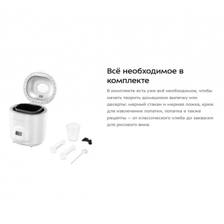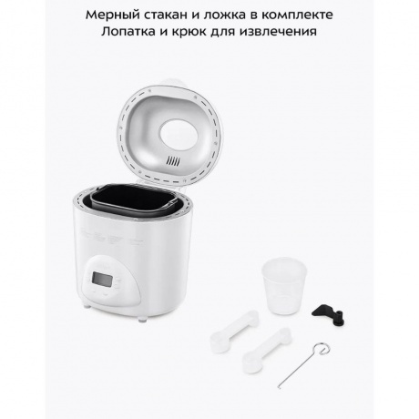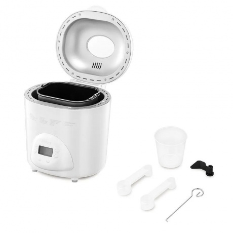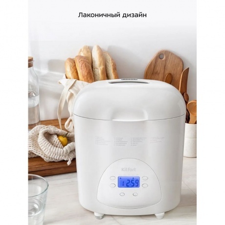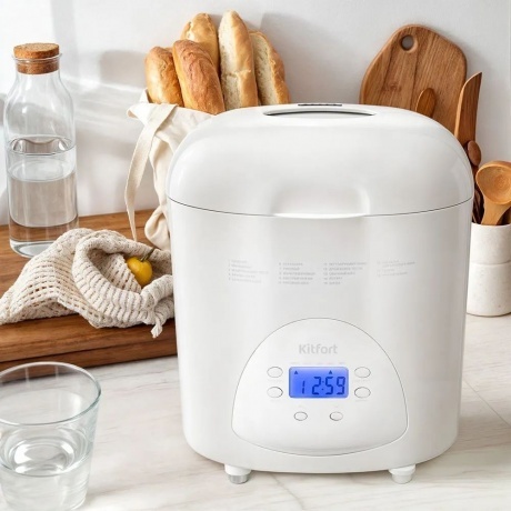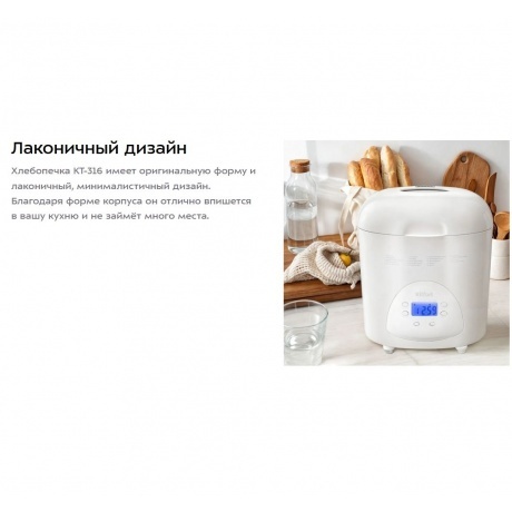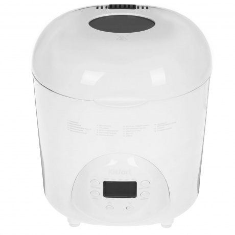 Хлебопечь Kitfort КТ-316 белого цвета мощностью 580 Вт подойдет для приготовления хлеба разных видов в форме буханок весом 450, 700, 900 г. В устройстве также можно готовить выпечку, сдобу, варенье и джем, а также делать закваску и дрожжевое тесто. Всего модель поддерживает 18 режимов работы. В меню также можно выбирать цвет корочки: от малой до сильной прожарки. Функция автоподогрева позволяет поддерживать блюда теплыми после завершения выпекания. Хлебопечь Kitfort КТ-316 изнутри имеет антипригарное покрытие. Оно позволяет готовить с минимальным количеством масла. К такой поверхности не прилипает даже жидкое тесто. В модели предусмотрен таймер. Он позволяет отсрочить старт работы на 15 часов. Процесс приготовления можно поставить на паузу и потом продолжить цикл. Оборудование издает звуковой сигнал. Он уведомляет, что в чашу нужно добавить дополнительные ингредиенты по рецепту. На лицевой панели есть дисплей для удобства отслеживания текущего режима и параметров работы. Дисплей подсвечивается в темноте. Через смотровое окошко можно визуально контролировать процесс приготовления.