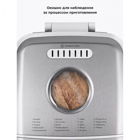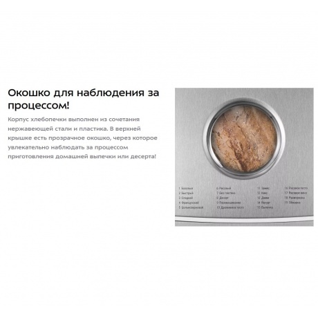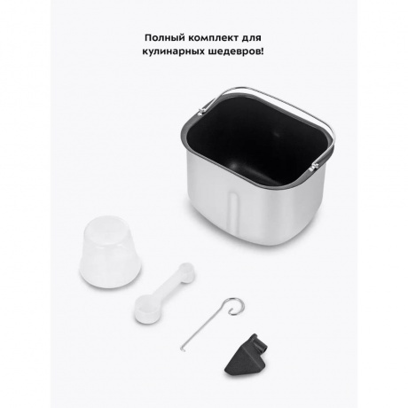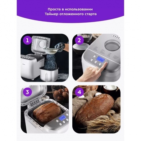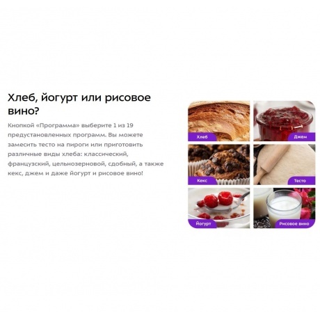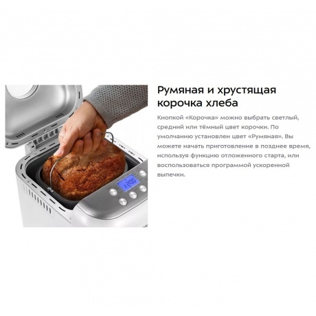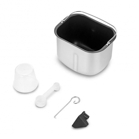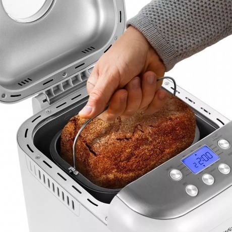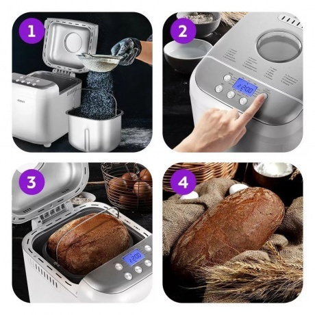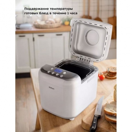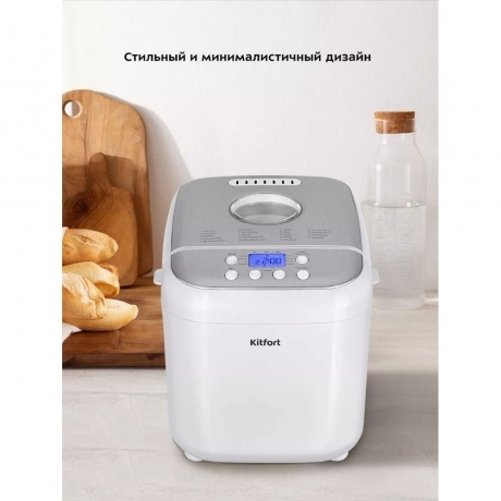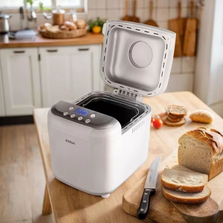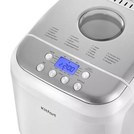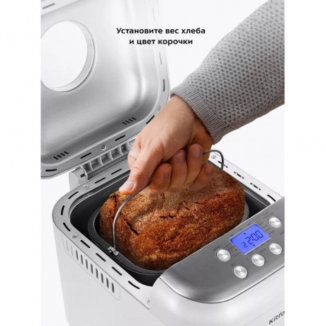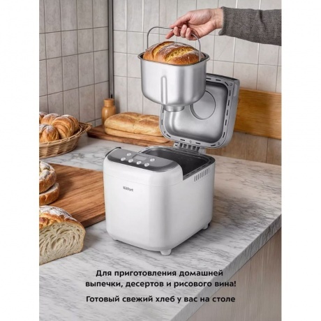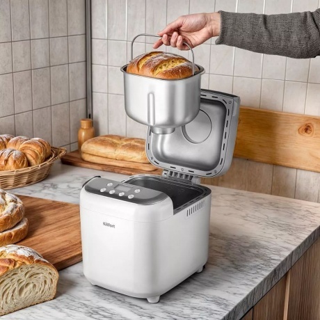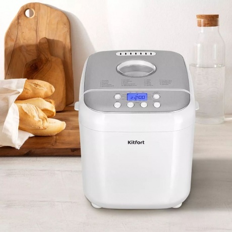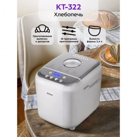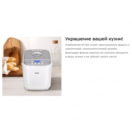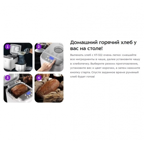 Хлебопечь КТ-322 позволяет готовить различные виды хлеба, тесто, кексы, джемы, йогурты и даже закваску для рисового вина. Загрузите ингредиенты, выберите программу - остальное прибор сделает сам. Разнообразие блюд обеспечено!. Панель управления хлебопечкой находится сверху устройства. Вы можете настроить вес выпечки 500, 750 или 1000 грамм. При изменении весы выпечки, меняется и время приготовления, чем больше вес готового хлеба, тем больше ингредиентов требуется замесить. В комплекте есть уже всё необходимое, чтобы начать творить домашнюю выпечку или десерты: мерный стакан и мерная ложка, крюк для извлечения лопатки, а также рецепты - от классического до безглютенового хлеба. Хлебопечка КТ-322 имеет оригинальную форму и лаконичный, минималистичный дизайн. Благодаря форме корпуса он отлично впишется в вашу кухню и не займёт много места.