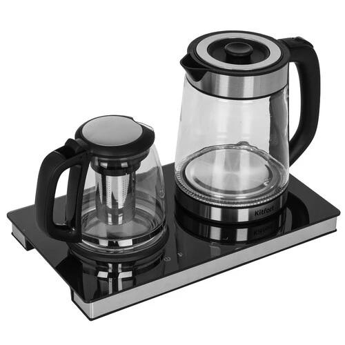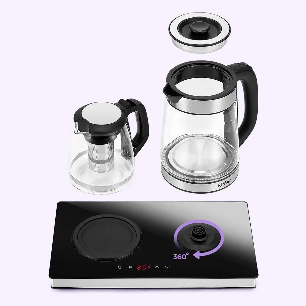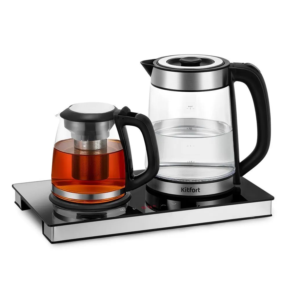 Чайный набор КТ-6736 состоит из чайника, заварочного чайника с фильтром и базы. Набор позволяет вскипятить воду до выбранной температуры, а также заварить не только чай, но и кофе с помощью специального режима подогрева.