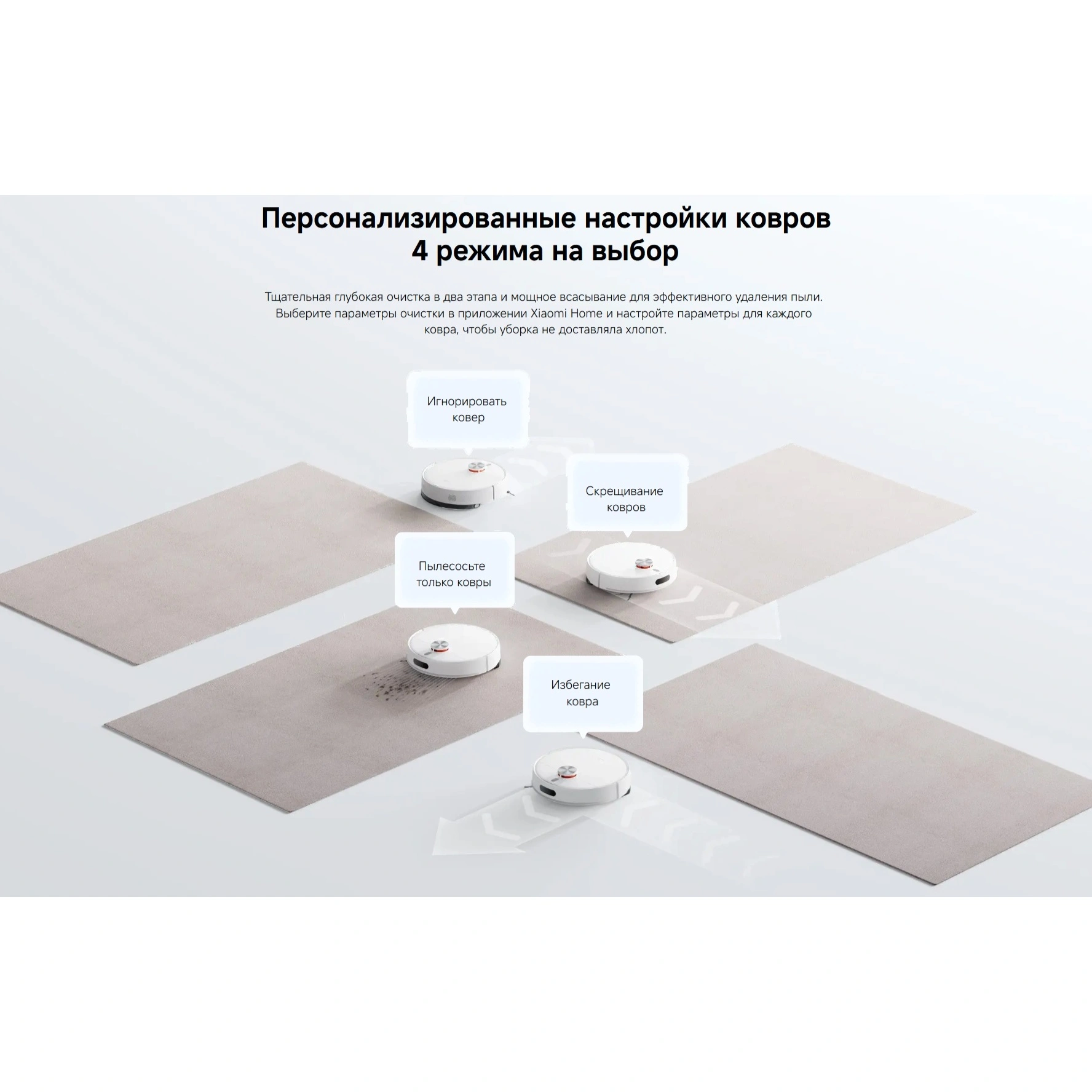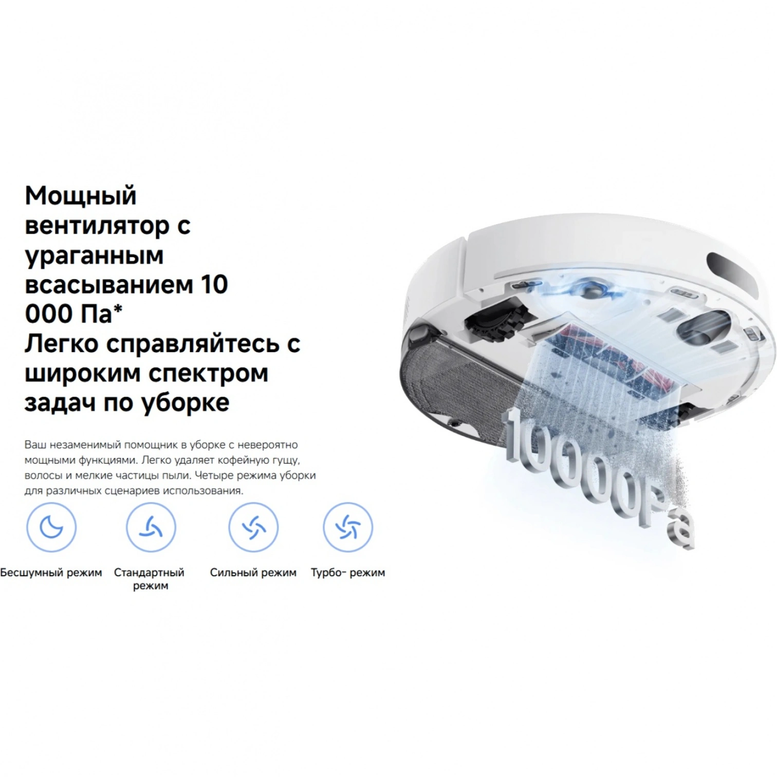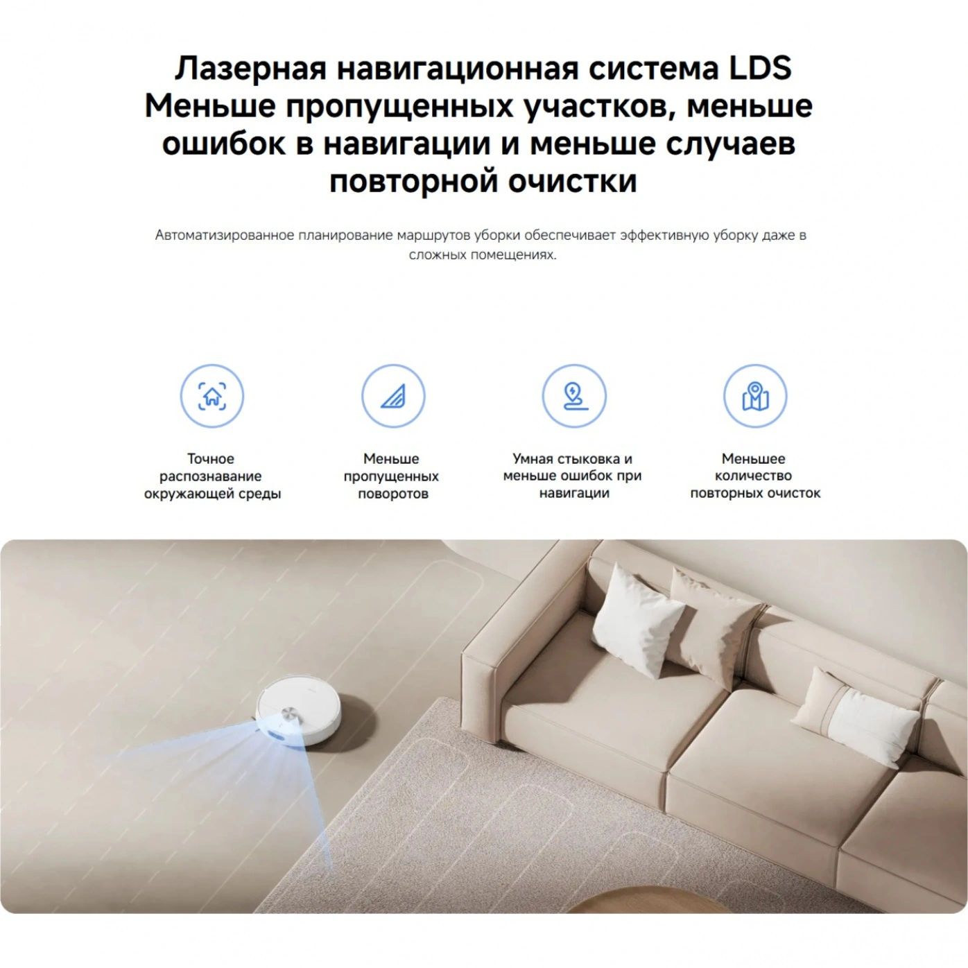 Благодаря системе LDS и множеству датчиков (обнаружения препятствий, перепадов высоты и столкновений) пылесос строит точную карту помещения и безопасно перемещается даже в сложной обстановке. Он легко преодолевает порожки до 20 мм и работает в четырёх режимах, подстраиваясь под разные типы поверхностей.
