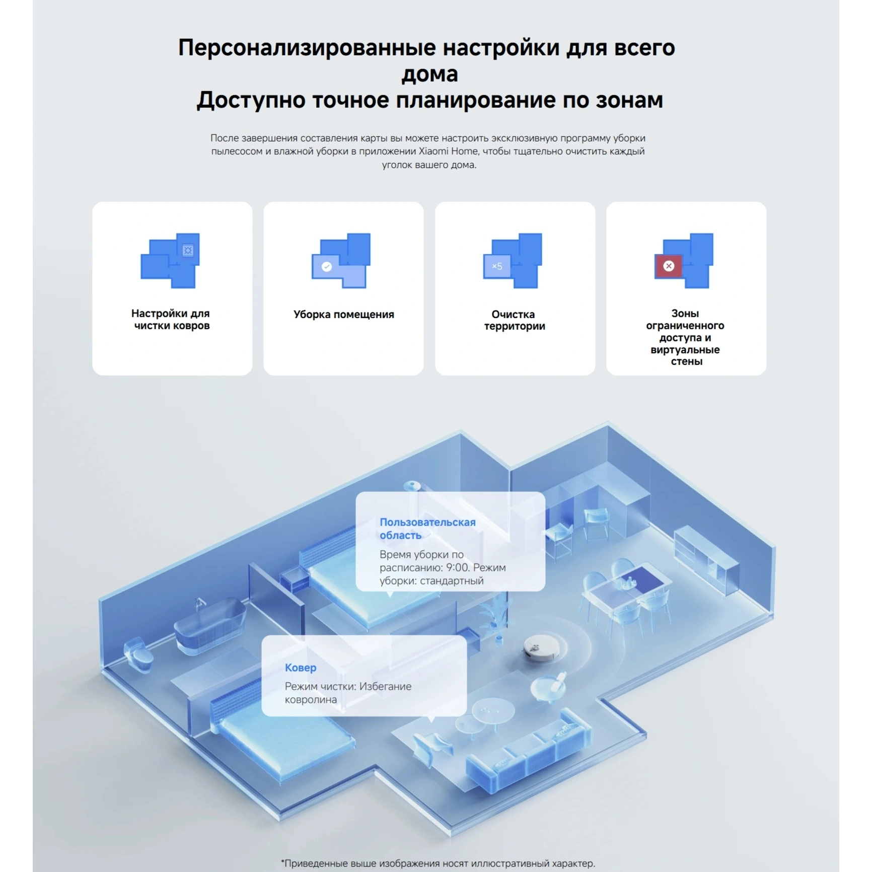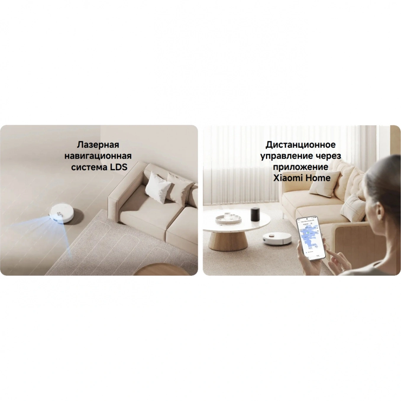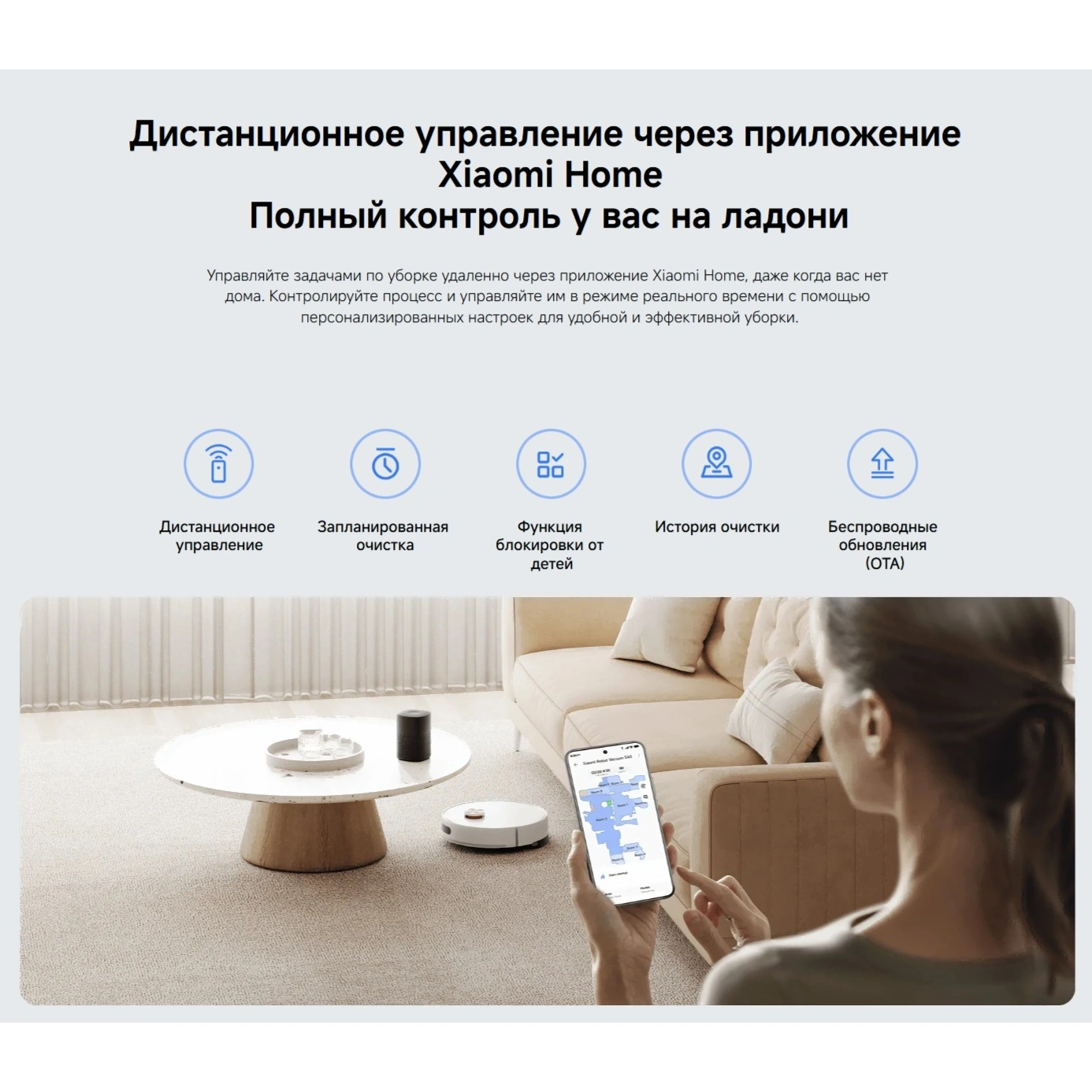 Управление полностью сосредоточено в смартфоне: можно задавать расписание, ограничивать зоны уборки, управлять картами комнат и регулировать подачу воды. Поддерживается голосовое управление через популярных ассистентов, что делает использование ещё комфортнее.