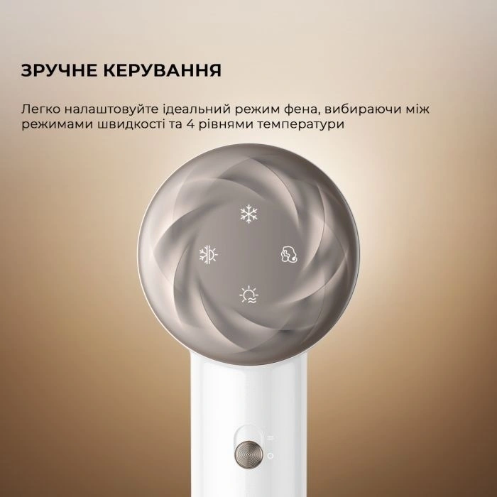Фен Dreame Glory Mix предлагает четыре режима температуры и два уровня интенсивности воздушного потока. Все параметры управляются с помощью интуитивно понятного дисплея, что позволяет легко настроить параметры в соответствии с типом волос и желаемым эффектом — от бережной сушки до динамичной укладки.