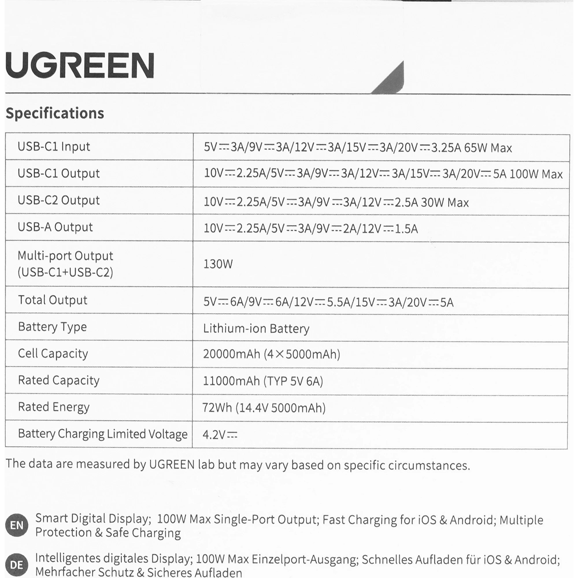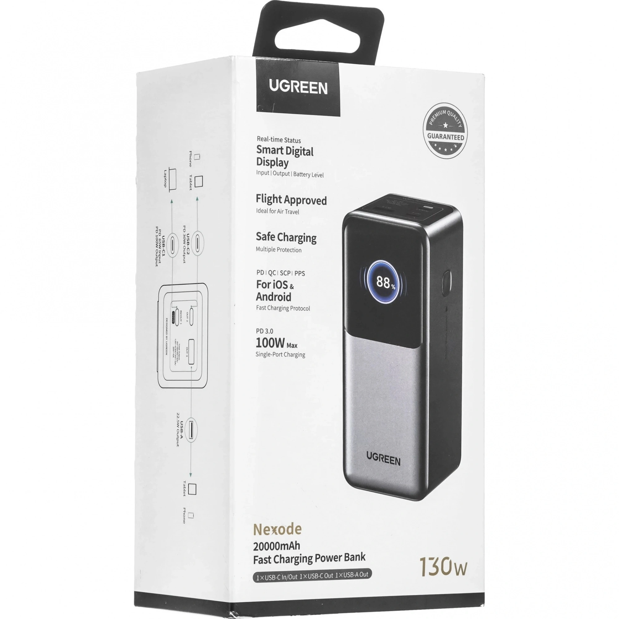 Сверхбыстрая зарядка 130 Вт: оснащенный 2 портами USB C и 1 портом USB A, внешний аккумулятор UGREEN с функцией быстрой зарядки поддерживает одновременную зарядку 3 устройств. USB C1 100 Вт + USB C2 30 Вт обеспечивают быструю зарядку для вашего ноутбука и телефона одновременно, MacBook Pro 16'' можно зарядить до 43% всего за 30 минут, а iPhone 15 можно зарядить до 60% за то же время, работайте без забот в любое время и в любом месте. Большая емкость 20000 мАч: внешний аккумулятор для ноутбука UGREEN емкостью 20000 мАч сохраняет заряд ваших устройств в течение нескольких дней, полностью заряжая iPhone 15 4 раза, iPad Pro 11" до 2 раз и MacBook Air 13" до 1,3 раза. Идеально подходит для путешествий, забудьте о беспокойстве о заряде батареи. Премиальный цифровой дисплей: усовершенствованный TFT-экран отображает подробную информацию, включая уровень заряда батареи, напряжение в реальном времени, ток в реальном времени и мощность зарядки различных портов. Вы можете интуитивно понять рабочее состояние каждого интерфейса и распределение питания. Состояние на первый взгляд, все под контролем. Мощный и портативный: использует усовершенствованную конструкцию силовой колонки, портативное зарядное устройство максимально использует пространство, сокращается до 5,1 ? 2,1 ? 2 дюйма, легко помещается в ладони. Вес всего 480 г, что снижает нагрузку в путешествии, перенося мощного и высокоемкого помощника по зарядке без каких-либо проблем. Заряжайте то, что хотите: аккумулятор UGREEN поддерживает такие протоколы зарядки, как PD, PPS, QC, AFC, FCP, SCP.