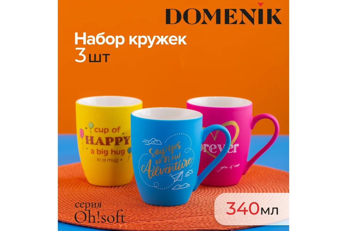 Кружки DOMENIK OH!SOFT стильные аксессуары для повседневного пользования. Набор из трех кружек емкостью 340 мл каждая идеально подойдет для утреннего кофе или чая. Благодаря эргономичной форме и удобной ручке, они легко ложатся в руку, обеспечивая комфорт при использовании. Каждая кружка выполнена из высококачественного материала, который гарантирует долгий срок службы изделий. Украсьте свою кухню стильными и функциональными аксессуарами от DOMENIK!