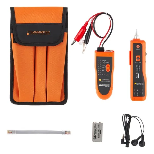 Тестовый набор предназначен для идентификации и отслеживания (трассировки) проводов и кабелей в пучках без разрушения изоляции. Состоит из двух приборов: передатчика (EMITER) и приемника (RECEIVER). Набор применяется при монтаже, тестировании и обслуживании компьютерных, телефонных и электрических сетей.