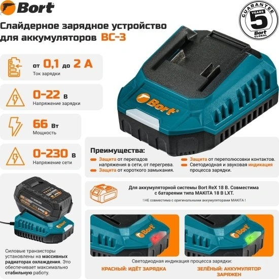 Зарядное устройство для электроинструментов Bort идеально подходит для обеспечения надежной и быстрой зарядки ваших инструментов. Оно специально разработано для работы с аккумуляторами типа Li-Ion, что гарантирует высокую эффективность и долговечность использования. Зарядное устройство поддерживает напряжение 22 В и обеспечивает ток зарядки 2 А, что позволяет быстро и безопасно заряжать аккумуляторы, минимизируя время простоя электроинструментов. Компактный и эргономичный дизайн устройства делает его удобным в эксплуатации и хранении. Незаменимый аксессуар для профессионалов и любителей, которые ценят производительность и надежность.