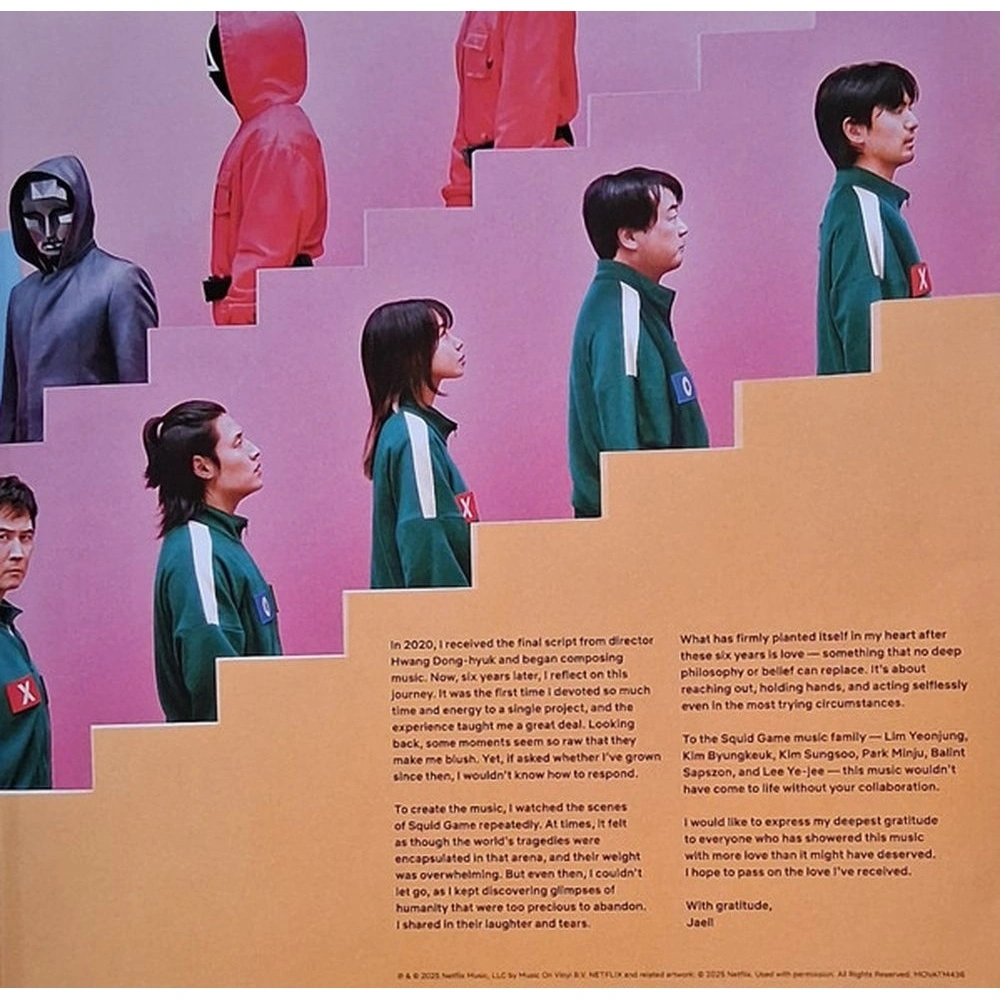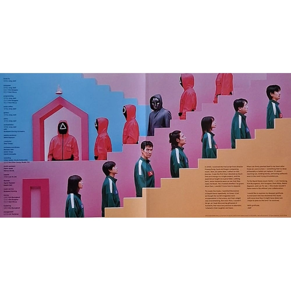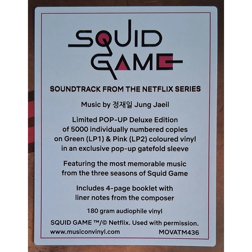 2LP — лимитированный тираж 180-граммового зелёного (LP1) и розового (LP2) винила в роскошном разворотном конверте с POP-UP Young-Hee. Включает 4-страничный буклет с аннотациями Чон Джэиля. Впервые доступен на виниле. Тираж этого издания — всего 5000 индивидуально пронумерованных экземпляров. Завораживающая и новаторская музыка Чон Джэиля к всемирно известному сериалу Netflix «Игра кальмаров» наконец-то выйдет на виниле этим летом! На протяжении трёх сезонов культовая музыка Чон ( автора «Паразитов» и «Микки 17» ) играла ключевую роль в создании напряжённой атмосферы и эмоционального воздействия сериала. Для этого винилового релиза Чон Джэиль эксклюзивно собрал лучшие моменты из трех сезонов «Игры кальмаров». На этом двойном альбоме вы услышите мастерское сочетание классических, электронных и минималистичных элементов, создающее звуковой ландшафт, отражающий психологическое напряжение и моральную сложность шоу. От жутких фортепианных мотивов до тревожных эмбиентных текстур, саундтрек усиливает напряжение и эмоциональную глубину этой драмы выживания. Саундтрек к фильму «Игра кальмаров» не только дополняет захватывающие визуальные эффекты шоу, но и является мастер-классом по современной телевизионной музыке. Творчество Чон Джэиля получило широкое признание, закрепив за ним репутацию одного из самых дальновидных современных композиторов.