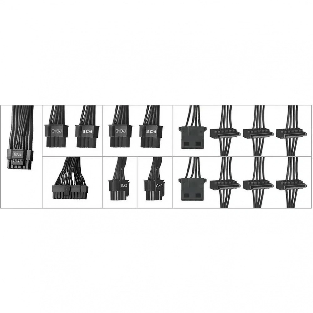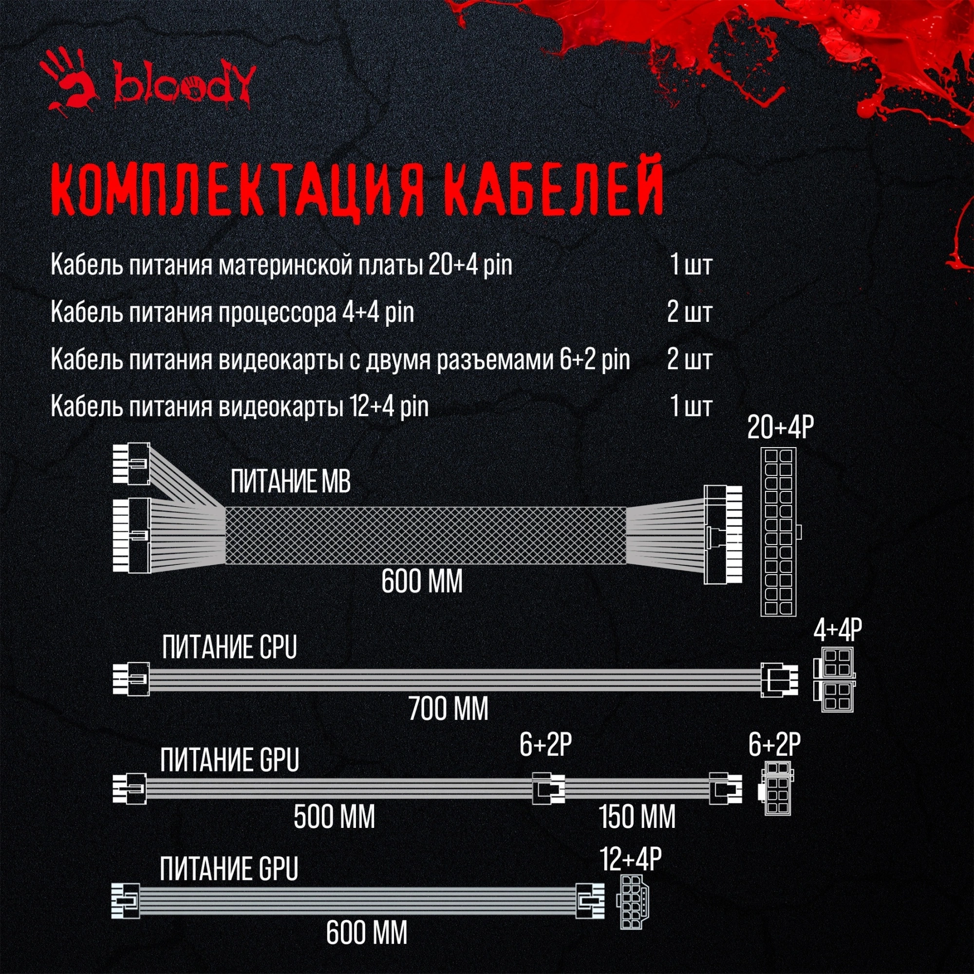 Сертификация 80 PLUS Gold подчеркивает высокую эффективность его работы, гарантируя минимальные потери энергии и более низкие затраты на электроэнергию. BLOODY предлагает широкие возможности подключения: разъемы для питания видеокарты 4х(6+2) + 16 pin, разъем питания материнской платы 20+4 pin, а также разъемы для процессора 2 x 4+4 pin. Эти особенности делают данный блок питания универсальным и подходящим для самых различных конфигураций ПК.