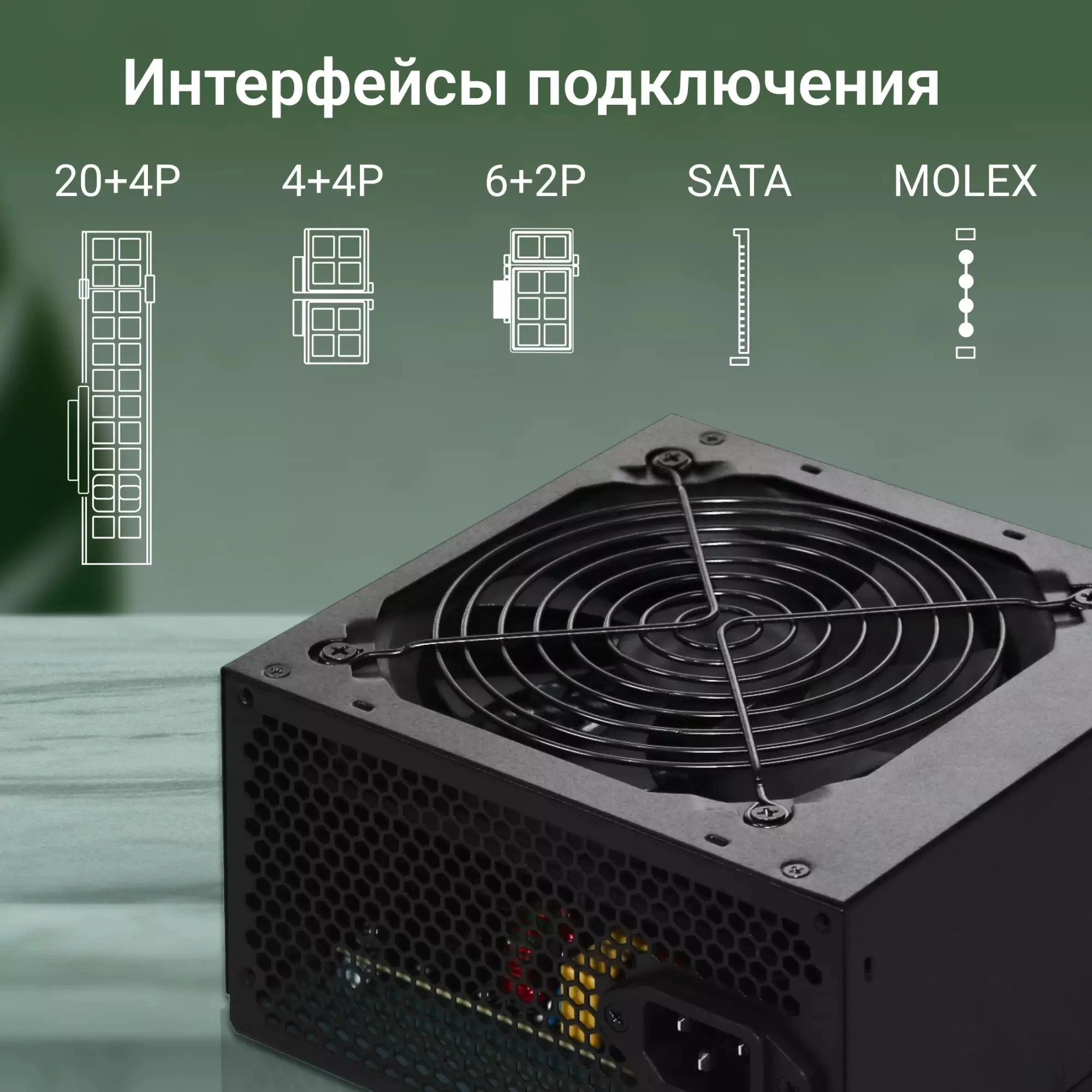 Блок питания подходит для материнских плат с разъемом 20+4 pin и выполнен в популярном форм-факторе ATX, что делает его совместимым с большинством современных корпусов. Несмотря на отсутствие сертификата 80 PLUS, Digma гарантирует стабильную подачу энергии для офисных и домашних компьютеров средней мощности.