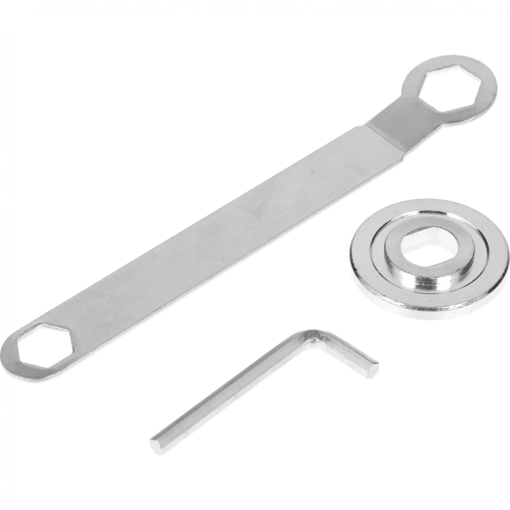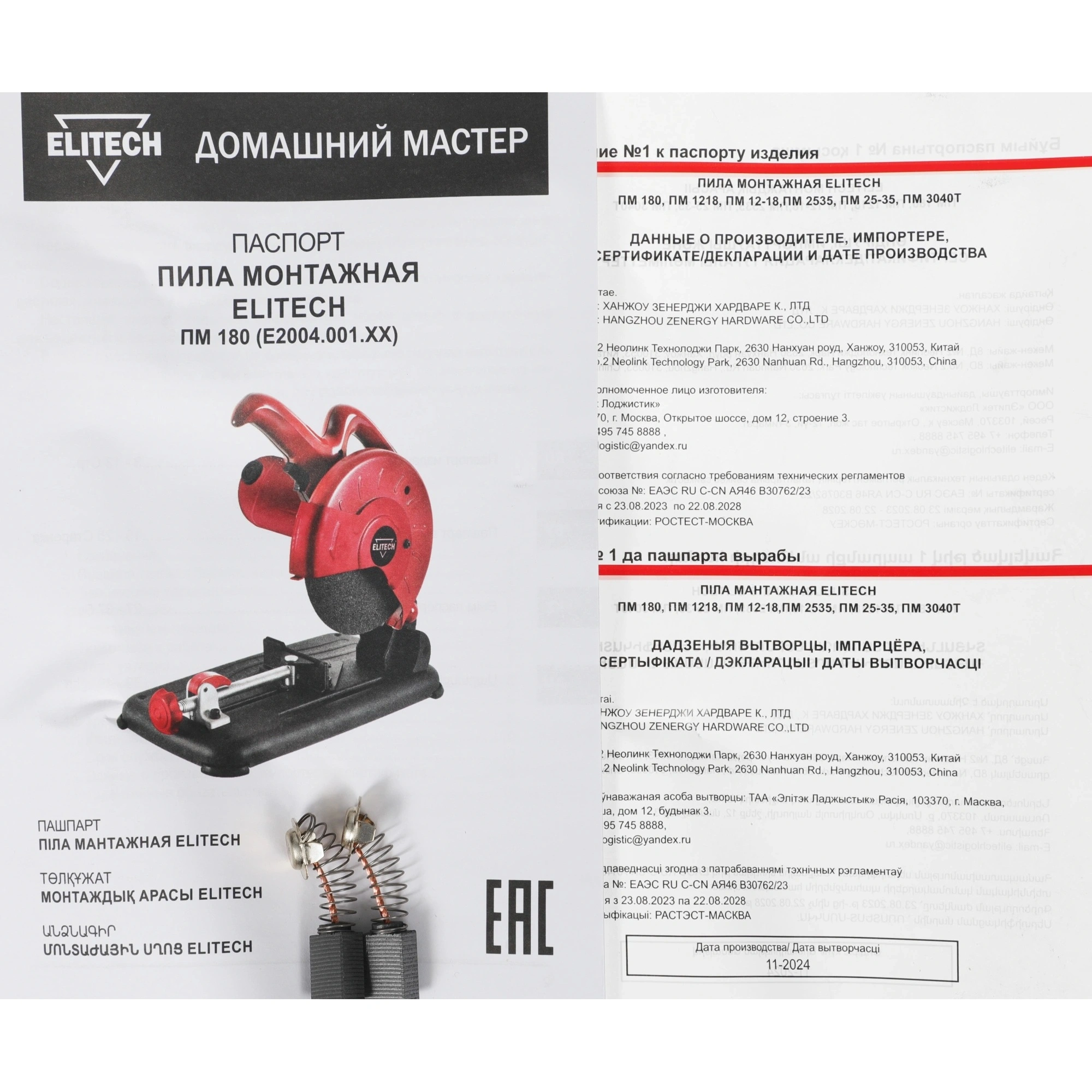 Отрезная пила, документация, ключ накидной, набор дополнительных щеток, отрезной диск, шестигранный ключ.