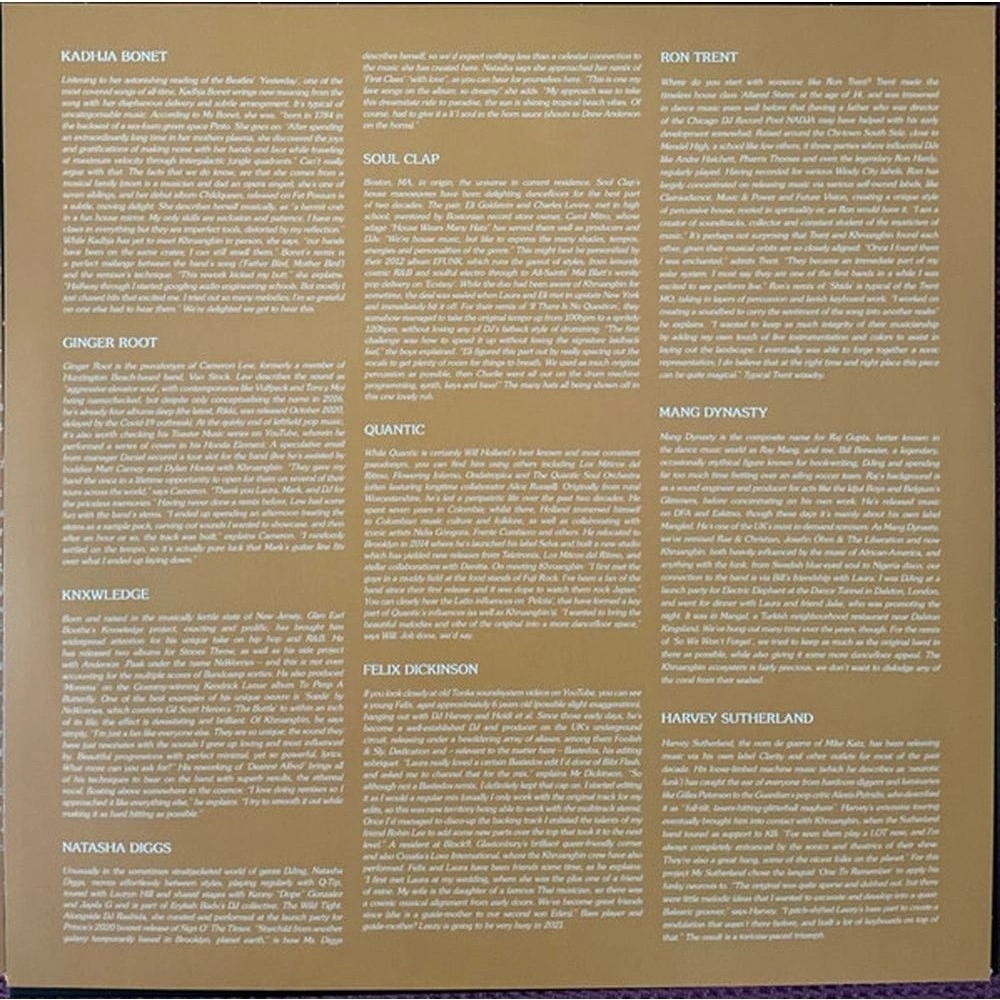 Khruangbin & Kadhja Bonet - Father Bird, Mother Bird (Sunbirds), Khruangbin & Ginger Root - Connaissais de Face (Tiger?), Khruangbin & Knxwledge - Dearest Alfred (MyJoy), Khruangbin & Natasha Diggs - First Class (Soul in the Horn Remix), Khruangbin & Soul Clap - If There is No Question (Soul Clap's Wild, but not Crazy Mix), Khruangbin & Quantic - Pelota (Cut a Rug Mix), Khruangbin & Felix Dickinson - Time (You and I) (Put a Smile on DJ's Face Mix), Khruangbin & Ron Trent - Shida (Bella Suite), K