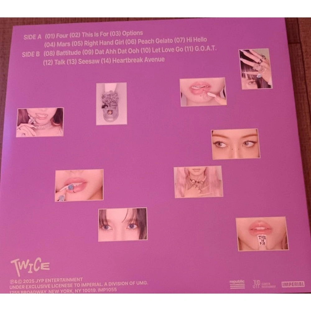 Four, This Is For, Options, Mars, Right Hand Girl, Peach Gelato, Hi Hello, Battitude (Nayeon, Jeongyeon, Momo, Mina), Dat Ahh Dat Ooh (Sana, Jihyo, Dahyun, Chaeyoung, Tzuyu), Let Love Go (Jeongyeon, Momo, Sana, Tzuyu), G.O.A.T. (Mina, Dahyun, Chaeyoung), Talk (Nayeon, Jihyo), Seesaw, Heartbreak Avenue