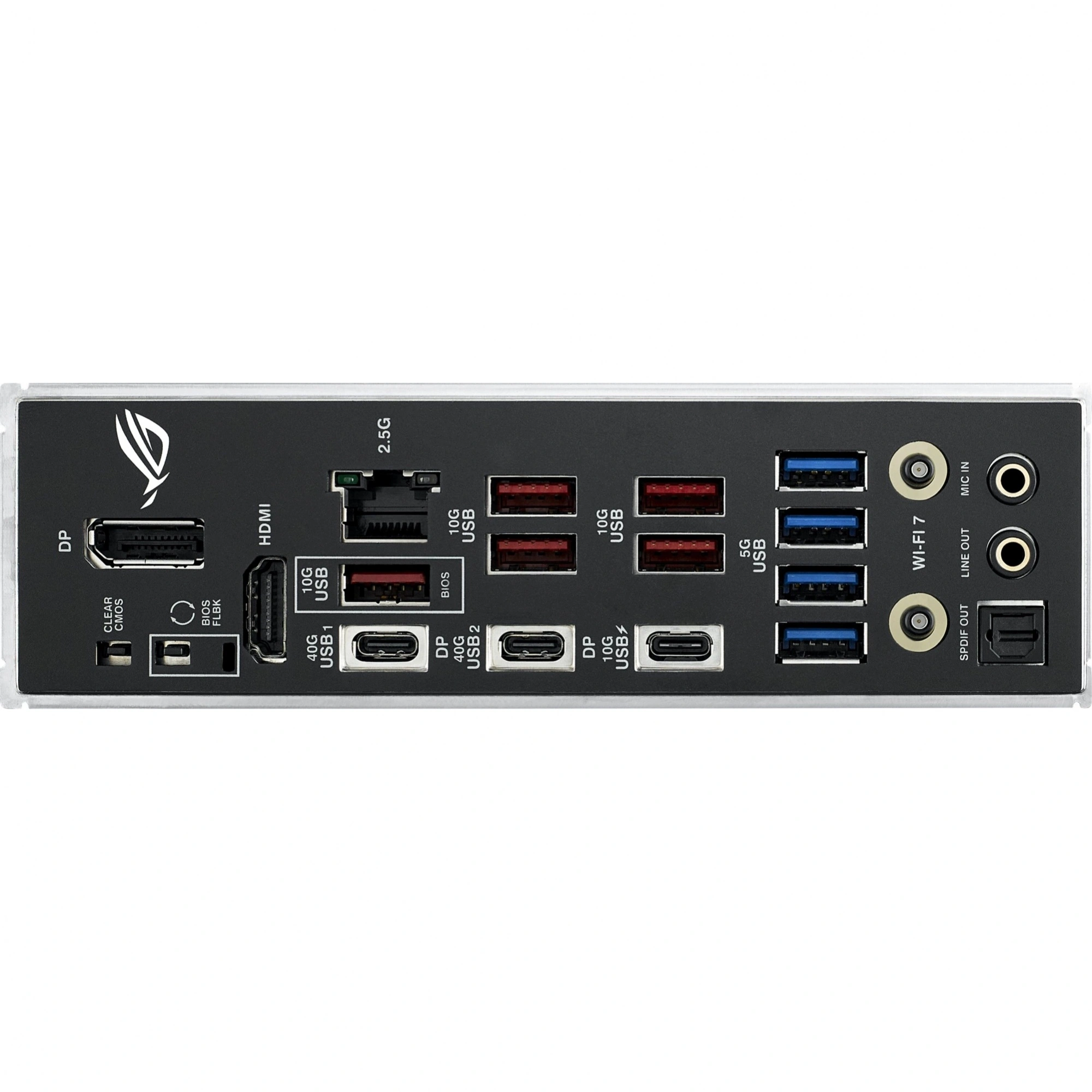 На задней панели расположен богатый набор портов, включая множество высокоскоростных USB, в том числе USB 3.2 Gen 2x2 и универсальные порты USB 4.0 Type-C. За сетевые возможности отвечает быстрый 2.5-гигабитный Ethernet-контроллер и встроенный беспроводной модуль с поддержкой новейшего стандарта Wi-Fi 7 и Bluetooth, обеспечивающий минимальные задержки в онлайн-играх. Качественный звук гарантирует фирменный аудиокодек SupremeFX, а для любителей кастомизации предусмотрена RGB-подсветка AURA Sync и разъемы для подключения дополнительных светодиодных лент.