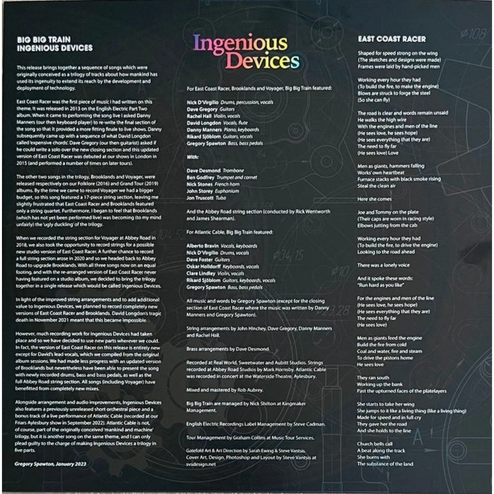 Британская группа Big Big Train, основанная в Борнмуте в 1990 году, добилась международной известности в жанре прогрессивного рока, заняв первое место в британских рок-чартах и ??45-е место в британском альбомном чарте 2017 года «Grimspund». Переработанные версии классических хитов Big Big Train «East Coast Racer», «Brookland» и «Voyager», а также новая, ранее не издававшаяся оркестровая композиция «The Book of Ingenious Devices», объединяющая «East Coast Racer» и «Brookland», были записаны с 17 струнными музыкантами в студии Abbey Road. Британские прогрессивные рокеры также представят концертную версию «Atlantic Cable» в исполнении Альберто Бравина во время выступления в Эйлсбери в сентябре 2022 года.